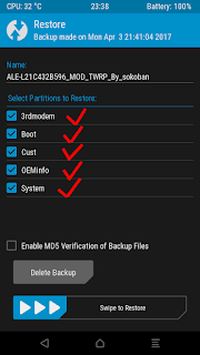 Me da error cuando intento hacer la instalación desde la restauración me solo me da dos opciones marcadas "inicio" y "sistema", no me sale ni 3rdmodem, ni cust, ni OEMinfo. Supongo que sera un error de la descarga pero si acceso a la carpeta si que están los archivos.... no se si me explico. Es como si TWRP no los reconociera