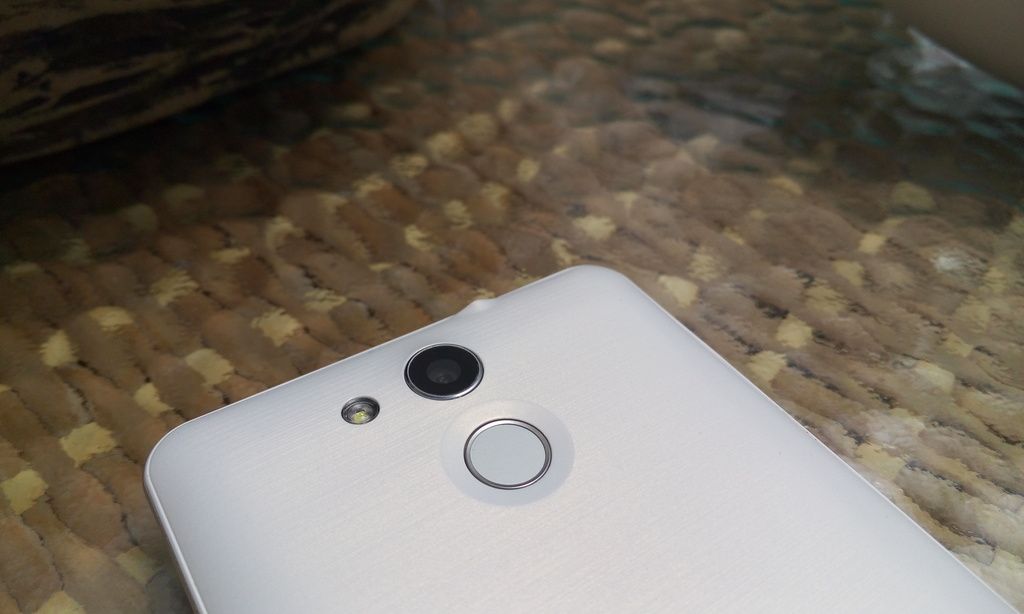 En la parte superior trasera podemos ver el sensor de la cámara principal sobresaliendo un poco del plano del teléfono, el sensor de huellas algo más hundido y rodeado como pasa con la cámara en un borde cromado.