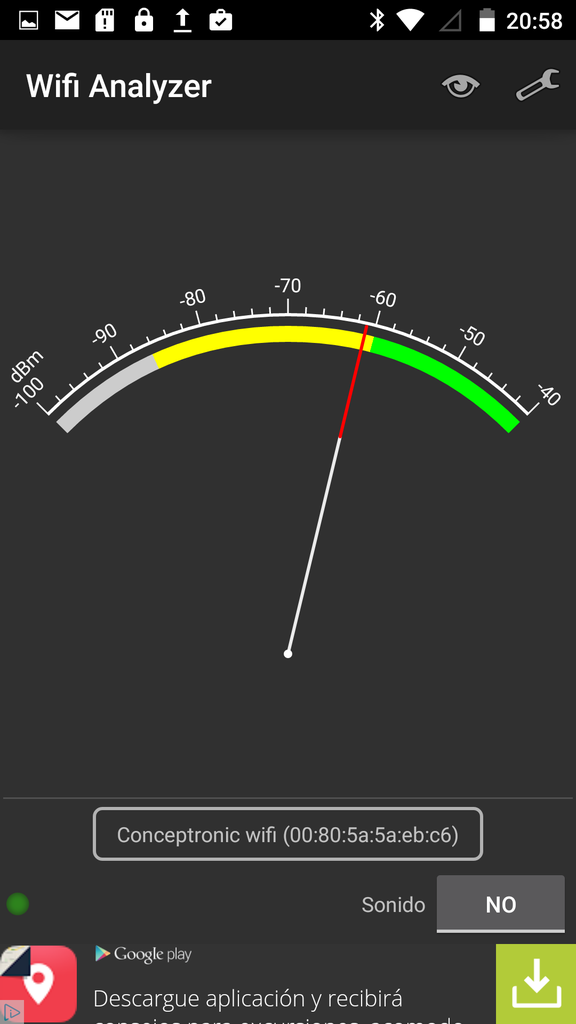 Mediante el uso de la aplicación WiFi analizer vemos que tal se comporta la antena. La prueba ha sido realizada a 5 metros con una pared de por medio del punto de origen. La verdad es que tiene bastante potencia, quedando por encima de otros dispositivos aunque los he visto aún mejor (hablo del cubot x11).