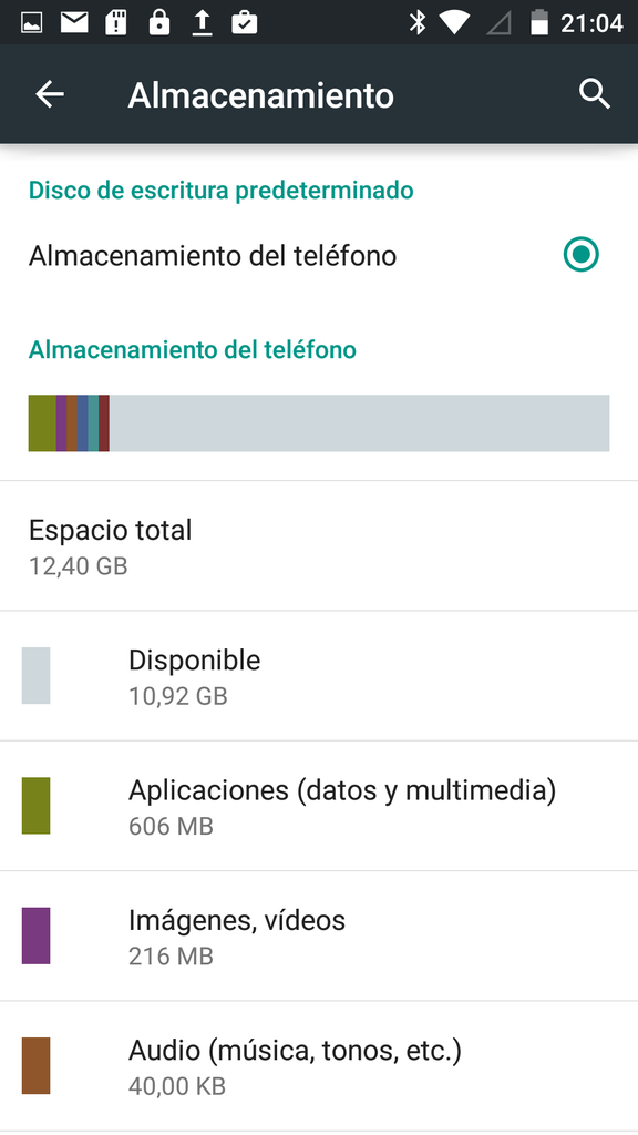 De los 16 Gb anunciados por el fabricante tenemos disponibles 12,40 en una única partición. Por supuesto, es ampliable mediante el uso de tarjetas micro USB de hasta 32 Gb.