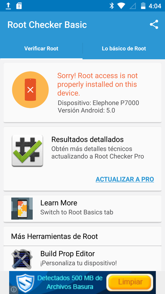 La aplicación root checker nos afirma que que nuestro Elephone p7000 no esta rooteado por lo que si lo necesitásemos tendríamos que buscar el método adecuado.