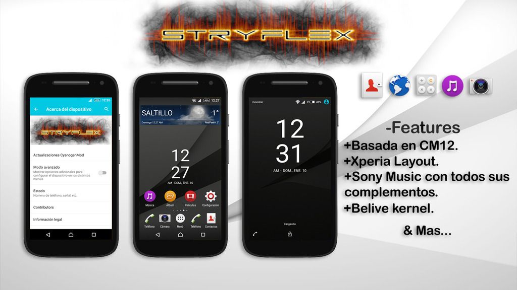 ![]() +FEATURES: Esta rom no es un port como tal del dispositivo "Xperia M", yo hice la rom desde 0, pues me encanta la apariencia xperia, aun que posee caracteristicas iguales a la rom original. -XPERIA Z5 SYSTEMUI -XPERIA MUSIC -ALBUM -MOVIES -TECLADO -SETTINGS -CAMARA DE MOTOROLA -BLOATWARE DE CM12 REMOVIDO -XPERIA HOME Z5 -XPERIA LIVE WALLPAPERS -XPERIA APPS -SOPORTE INIT.D -PURE PERFORMANCES X +BUGS: -NO FUNCIONA AJUSTES DE IMAGEN -EL REPRODUCTOR MUESTRA UN BUG CUANDO SE REPRODUCE UNA CANCION EN LA SYSTEMUI -SOLO FUNCIONA EL PIN 3x3 -¿? Notificarme a mi sobre mas bugs. ADDONS: +INSTALACION: -COLOCAR LA ROM CYANOGENMOD 12 EN TU TARJETA SD,INICIAR TWRP. HACER WIPE CACHE, DALVIK Y DATA Y SEGUIDAMENTE SELECCIONAR LA ROM Y FLASHEAR -UNA VEZ INICIADO CM12, INICIAMOS NUEVAMENTE EN TWRP Y FLASHEAMOS STRYFLEX ROM, STRYFLEX XPOSED SIN NINGUN WIPE -PARA INSTALAR CUALQUIER MOD ANTES MENCIONADO SOLO FLASHEAMOS SIN NINGUN TIPO DE WIPE +CREDITOS: |