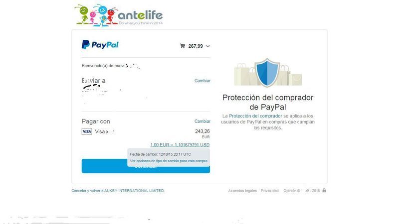 1,00 EUR = 1,101679791 USD te da las opciones ![]() y pone PayPal ofrece 2 formas sencillas de convertir divisas: Tipo de cambio de divisas de PayPal: 1,00 EUR = 1,101679791 USD Puede que el emisor de mi tarjeta tenga un proceso de conversión de divisas y he decidido no usarlo. No recurriré contra el emisor de mi tarjeta con respecto a ningún asunto relacionado con esta conversión. Tipo de cambio del emisor de la tarjeta: El emisor de mi tarjeta determina el tipo de cambio y las tarifas. El tipo y las tarifas aparecerán en el extracto de mi tarjeta. Última edición por Yosu69 Día 12/10/15 a las 20:38:17 |