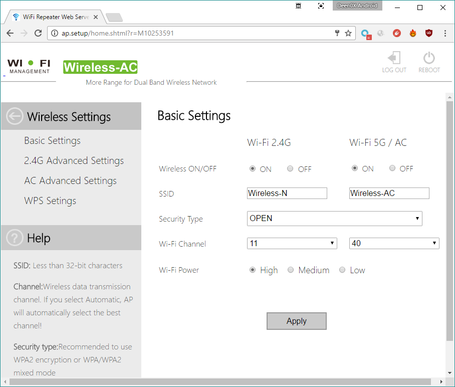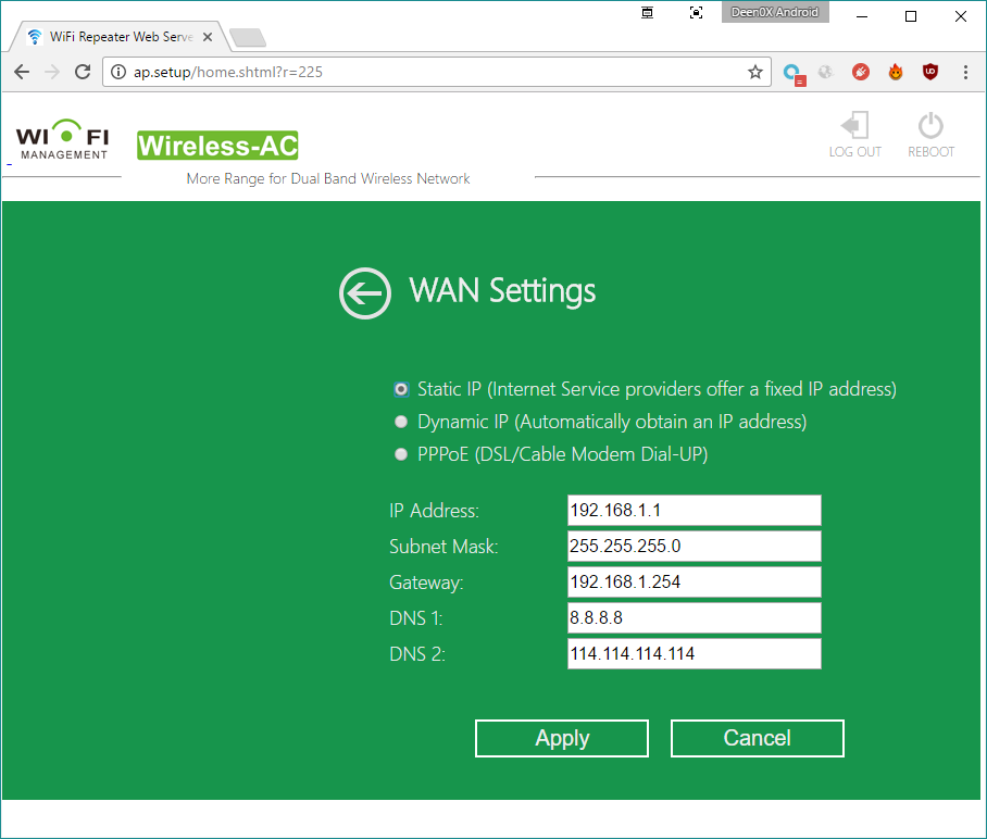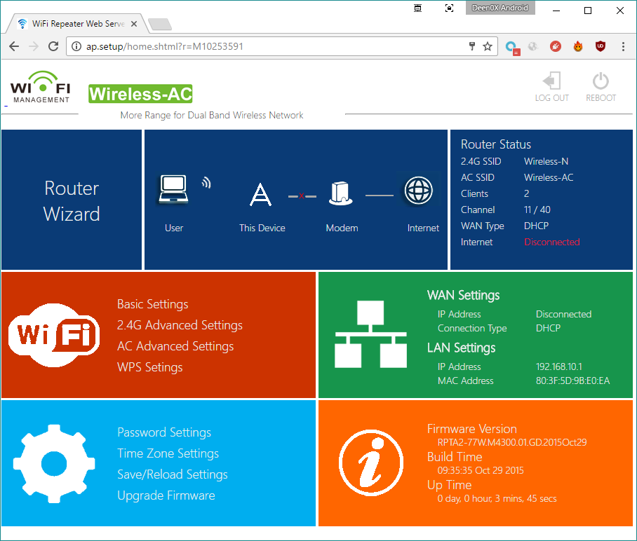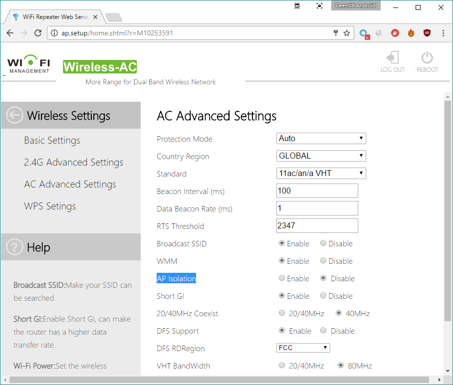 Interfaz de usuarioLa interfaz de usuario es bastante simple, ofreciendo algunas configuraciones avanzadas (pocas) para que el usuario pueda tocar, pero estas configuraciones dependerán del modo en el que estemos utilizando el dispositivo. Una vez que encendemos el dispositivo, por defecto se creará una red Wireless-N (para la banda 2.4Ghz) y otra Wireless-AC (para la banda 5Ghz) Con un móvil u ordenador nos conectaremos a cualquiera de estas bandas, y una vez conectados accederemos a la interfaz de gestión del dispositivo en una de las siguientes direcciones: A grandes rasgos, la interfaz se compone por las siguientes ventanas: Pantalla de login. Por defecto el usuario y clave son "admin" (en minúsculas) La primvera vez que ingresamos nos salta un aviso para cambiar la clave por defecto. Pantalla para cambiar la clave. Luego de introducir una nueva (y usuario también podemos cambiarlo), el router se reiniciará. Ingresamos nuestro nuevo usuario y clave de administración. Como se ve en la imagen, el idioma puede ser Ingles o chino. La pantalla principal de gestión del dispositivo. Desde esta pantalla podemos ir a varias secciones, las cuales tendrán opciones habilitadas o deshabilitadas en función del modo en el que esté trabajando el dispositivo. Opciones básicas de las 2 redes inalámbricas. Nota: Ambas comparten la mismca clave Opciones específicas para la red de 2.4Ghz Opciones específicas para la red de 5Ghz A destacar la opción de AP Isolation existente para ambas redes, y que nos puede resultar útil si queremos crear una red para "invitados" y que no se puedan comunicar entre varios dispositivos. Configuración de WPS para permitir una conectividad mas fácil de otros dispositivos con el Dodocool AC750 A destacar que no es posible cambiar el PIN, pero si que podemos habilitar o deshabilitar el uso de esta característica. Desde la ventana principal, también podemos acceder a la configuración WAN (nuestro acceso a internet). En el caso del ejemplo, se ha asignado de forma manual la configuración de la IP, la cual debe ser una IP válida del router principal (en este caso, el router está en 192.168.1.254), y el resto de parámetros para poder obtener conectividad con nuestra red. También podemos dejar la configuración que se gestione mediante el servidor DHCP del propio router principal. Por último podemos proporcionar la información de conectividad de nuestro ISP para obtener internet de forma directa. En esta pantalla configuramos nuestra subred que estamos creando, y habilitamos el servidor DHCP del propio dispositivo, o podemos configurarlo en AUTO para que gestione el mismo la asignación de IPS por el servidor DHCP del router principal, o la de el propio dispositivo. En la sección de configuraciones generales podemos asignar la zona horaria del dispositivo También podemos guardar la configuración actual en un fichero que almacenamos de forma local, como además podemos resetear todas las configuraciones y dejar el dispositivo con su configuración de fábrica. Por último, tenemos la pantalla de actualización del firmware del dispositivo, que hasta el momento no he tenido necesidad de utilizar. Existen otras pantallas que, dependiendo del tipo de uso que estemos dando al dispositivo (modo de uso) pueden presentar una u otra forma. Modos de usoEl dispositivo cuenta con 3 modos de usos principales, siendo 2 de ellos bastante similares y que pueden llevar a confusión Modo Router: Este modo está pensado para dar cobertura Wifi en instalaciones con internet que no cuenten con un router Wifi al uso. Hoy en día es difícil encontrar un proveedor de internet que no ofrezca un router wifi, pero es una posibilidad, y este modo precisamente es para estos caso. En este modo, conectaremos la línea de datos ADSL desde nuestro router (por un cable RJ45) al Dodocool AC750, y a continuación configuraremos el dispositivo para funcionar en modo Router (moviendo el switch al modo Router) Uno de los puntos a destacar de este modo es que los equipos que se conecten a este modo, obtendrán una IP de la subred generada por el dispositivo, por lo que todo el conjunto se conectará mediante una única IP registrada en el router principal. Modo AP: Este modo básicamente es muy similar al modo Router, con la diferencia que los equipos conectados configurarán su conexión como una entrada nueva en el router principal por cada equipo registrado. Dicho en otras palabras, con este modo conectarás directamente al router los equipos que se conecten al Dodocool AC750 Modo Repeater. Este es el modo mas simple y útil del dispositivo. En este modo, simplemente nos conectaremos a una red WIFI exsitente, ya sea mediante WPS o ingresando la clave necesaria para realizar la conexión y con esto ampliar la cobertura Wifi de nuestra red principal. Saltando lo evidente y que es la repetición o extensión de nuestra red wifi de casa, me he centrado en realizar pruebas de streaming con el dispositivo. Al momento de realizar mis pruebas, cuento con 2 dispositivos capaces de conectar redes de 5GHz, pero a una velocidad máxima de 150Mbps, por lo que no he sido capaz de realizar una prueba con todo el ancho de banda que puede ofrecer el dispositivo. Aún asi, creo que es una buena prueba, puesto que la mayoría de casos serán como el mío, que mezclará dispositivos a, b, g, n y c, y mas que buscar un dispositivo de alto rendimiento, lo que queremos es solucionar problemas de conectividad, y para este propósito este Dodocool AC750 cumple bastante bien. He hecho pruebas en Android, utilizando Moonlight, y en Windows, utilizando In Home Streaming de Steam. En el caso de Moonlight, corriendo a 1080p/60fps, el sistema tiene muchas relentizaciones, por que el ancho de banda no es suficiente para desplegar la imagen de vídeo a esa resolución y velocidad. Probando en 720p/30fps los juegos son mucho mas fluídos, aunque distan de ser igual de suaves que un buen router dual-band. Hay que consi