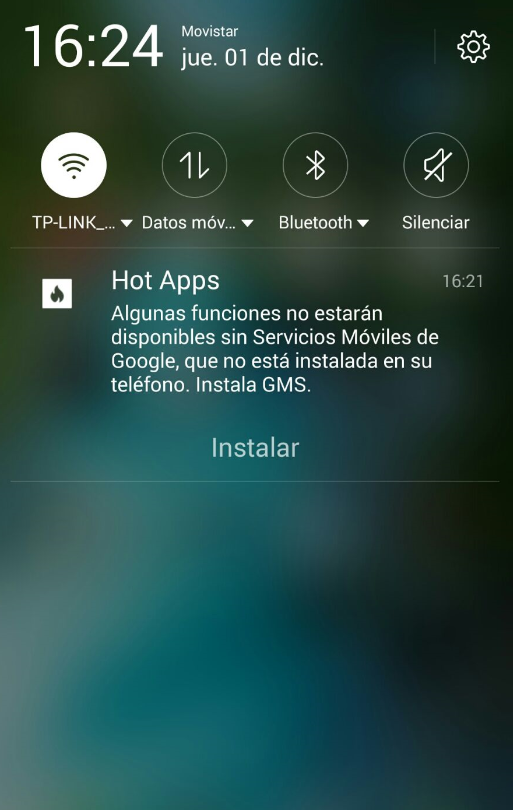 Entra en la aplicación Hot Apps e instala la app GMS y ejecútala para instalar los servicios de google. Después puedes eliminar la app GMS. Con esto ya no debería aparecerte la notificación. |