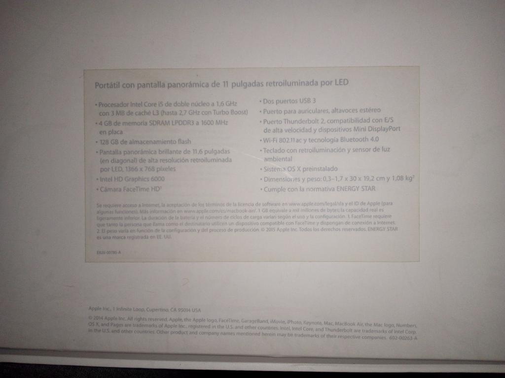 * Sobre el envío: Gastos incluidos * ¿Dispones de factura?: Sí * Fecha de la factura: 18/04/2015 * ¿El producto está en garantía?: Sí Otros datos de interés * Descripción general y otros comentarios: Macbook air de 11'' en perfecto estado. Se vende o cambia por usar poco en los últimos meses y más teniendo un sobremesa gaming. Dispongo de caja original (ver fotos). Cambio por iPad o móvil gama alta, ajustando precio en su caso * Certifico que la descripción aportada es correcta: Sí * Certifico que no estoy vendiendo un producto ilegal o una réplica: Sí * Acepto las normas de la sección de compra y venta de HTCMania: Sí Fotografías reales del material * Última edición por nogod Día 08/01/17 a las 14:07:49. |