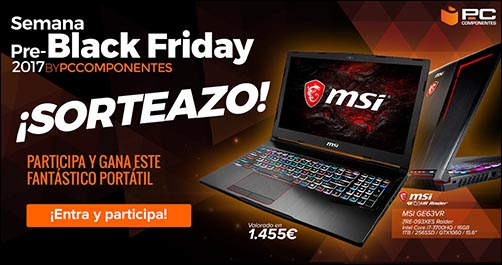 Semana Pre-Black Friday en PcComponentes ![]() Durante la semana Pre-BlackFriday, PcComponentes va a realizar un sorteo cada día en sus redes sociales. Cada sorteo tendrá una duración de 24 horas y los premios van a ser muy importantes. Se puede participar desde Facebook o desde Twitter. Hoy lunes acaban de lanzar el primero, cuyo regalo es un portátil Msi GE63VR, valorado en más de 1400€. Para participar solo tienes que entrar en su página de Black Friday, rellenar el formulario que aparece y seguir las bases para hacer lo que piden si participas desde Twitter o desde Facebook. Además del sorteo, PcComponentes irá lanzando ofertas puntuales durante esta semana Pre Black Friday en la misma página del sorteo. ¡Suerte! |
