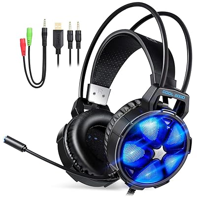 Auriculares Estéreo Gaming con Micrófono y Control de Volumen con Cable 2 en 1 para PC, Mac, Xbox One, PS4, Smartphone, Nintendo Switch, Iluminación LED (Negro+Azul)