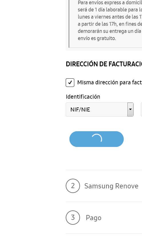 Hola compañeros, estoy intentando precomprar el S10+ en la web de Samsung y todo va bien hasta que me pide insertar el DNI y de ahi no pasa, se queda cargando y no hace nada (ver foto). He probado con varios DNIs y navegadores y hace lo mismo. ¿A alguien le ha pasado lo mismo o sabe como solucionarlo?