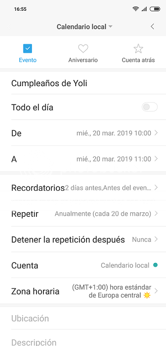 Si tengo las fechas como un evento más sí me las recuerdo, pero los aniversarios dentro de los contactos no, ni el calendario de Google ni el de Xiaomi. |