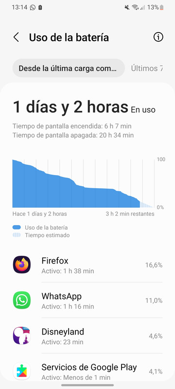 Estos meses de verano lo he llevado sin hacerle "debloat", sin deshabilitar NINGUNA aplicación, y con más uso de datos móviles, ya que viajas más, sitios nuevos, más uso de ubicación, más brillo de pantalla por estar en exteriores, más playa, menos wifis, más necesidad de tener disponibles todas las apps que me convienen... y el consumo sigue siendo bueno. Este resultado de carga, de ahora mismo como digo, es con esta configuración que acabo de comentar (sin deshabilitar ninguna aplicación).