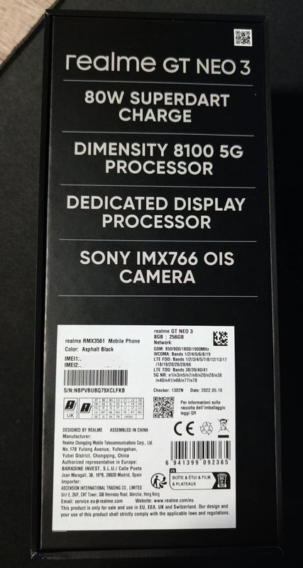 * Sobre el envío: Incluido en el precio por Correos Paq. Estandar con Nº de seguimiento y sin asegurar. * ¿Dispones de factura?: Sí * Fecha de la factura: 19/08/2022 (Amazon.es) * ¿El producto está en garantía?: Sí Otros datos de interés * Descripción general y otros comentarios: Pues eso, vendo este Realme GT Neo 3 versión de carga rápida de 80W. Color negro, versión 8/256GB de memoria. Funciona muy bien y está en perfectísimo estado. Actualizado a Android 13. La verdad es que me ha gustado mucho tenerlo. Funciona realmente bien. Carga superrápida a 80W, en 35 mins. lo tienes a tope. Comprado libre en Amazon.es en Agosto de 2022, entrego factura de compra. Dispongo de accesorios originales así como embalaje original. Todo en perfecto estado. El motivo de la venta es haber comprado el Samsung S23+. * Certifico que la descripción aportada es correcta: Sí * Certifico que no estoy vendiendo un producto ilegal o una réplica: Sí * Acepto las normas de la sección de compra y venta de HTCMania: Sí Fotografías reales del material * Última edición por javi691 Día 13/02/23 a las 23:39:00 |