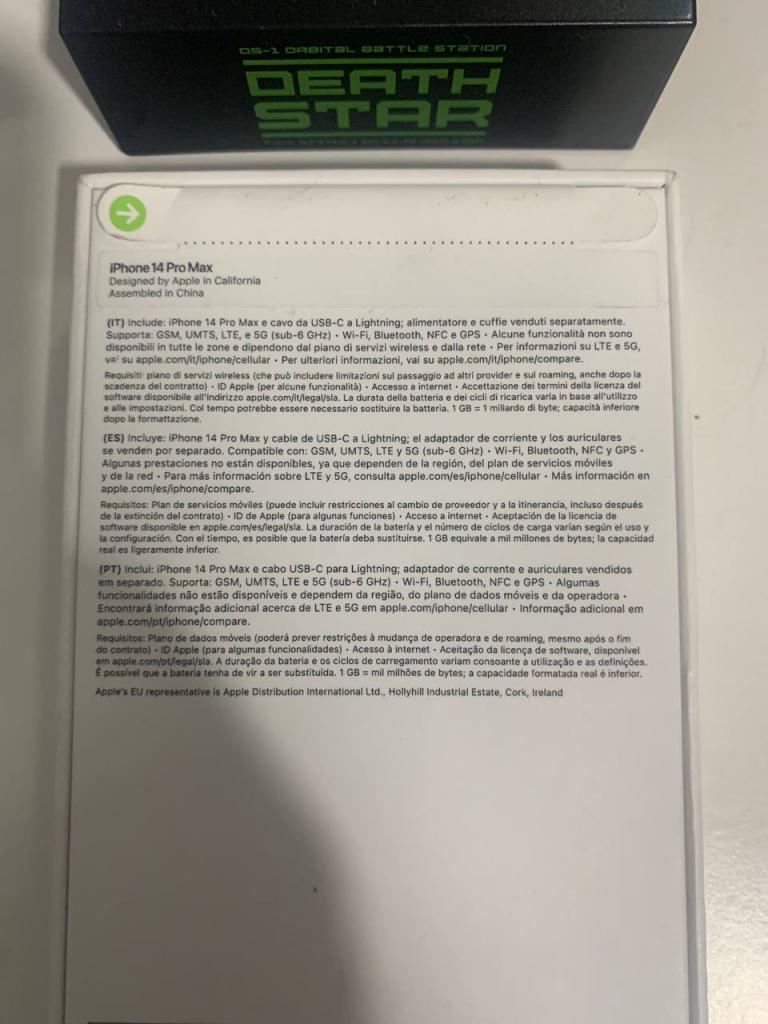 * Sobre el envío: - * ¿Dispones de factura?: Sí * Fecha de la factura: Febrero 2023 * ¿El producto está en garantía?: Sí Otros datos de interés * Descripción general y otros comentarios: iPhone 14 pro Max 256GB Color morado, precintado Factura Tres años de garantía Teléfono libre. * Certifico que la descripción aportada es correcta: Sí * Certifico que no estoy vendiendo un producto ilegal o una réplica: Sí * Acepto las normas de la sección de compra y venta de HTCMania: Sí Fotografías reales del material * Última edición por todoestaseco Día 24/02/23 a las 11:32:39. |