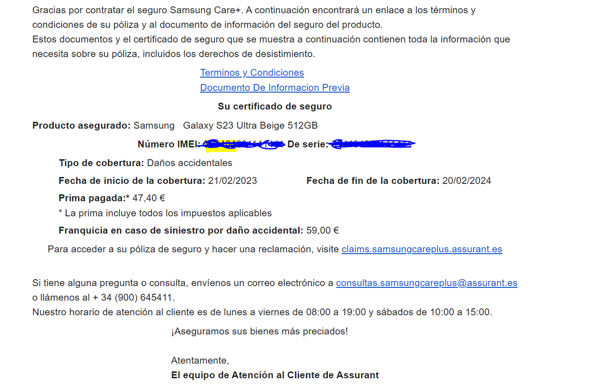 Debe ser que ya han corregido la incidencia que tenía, que anunciando franquicia de 59 euros, al contratar la aplicaban de 99. Yo me he hartado de llamar, y nadie el el teléfono de Samsung sabe nada de Samsung Care+, y en el teléfono que viene en el email de la póliza te dicen que no lo pueden cambiar. Habría que probar a cancelar la póliza (hay un periodo de desestimiento de 14 días) y volver a contratarla. |