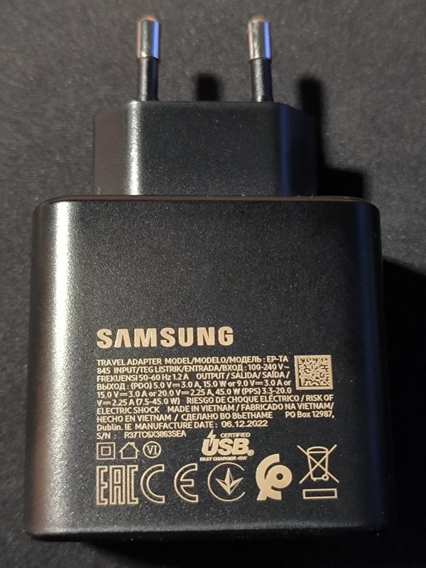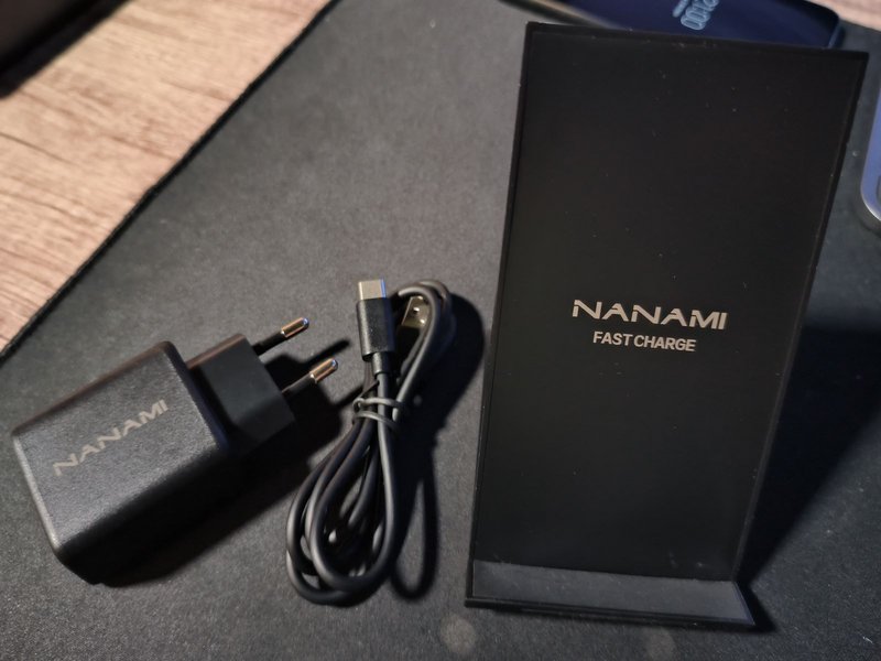 Regalo cargador original USB-C Samsung de carga rápida de 45W y un cargador inalámbrico comprado en Amazon de la marca Nanami, con carga de 15W y totalmente compatible.