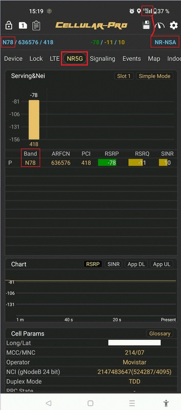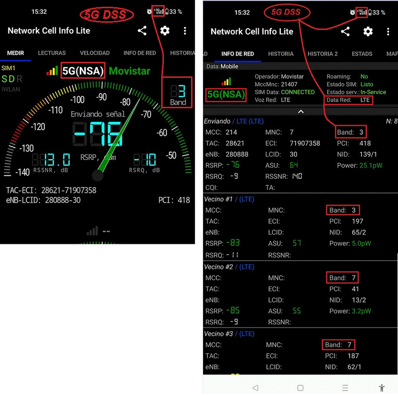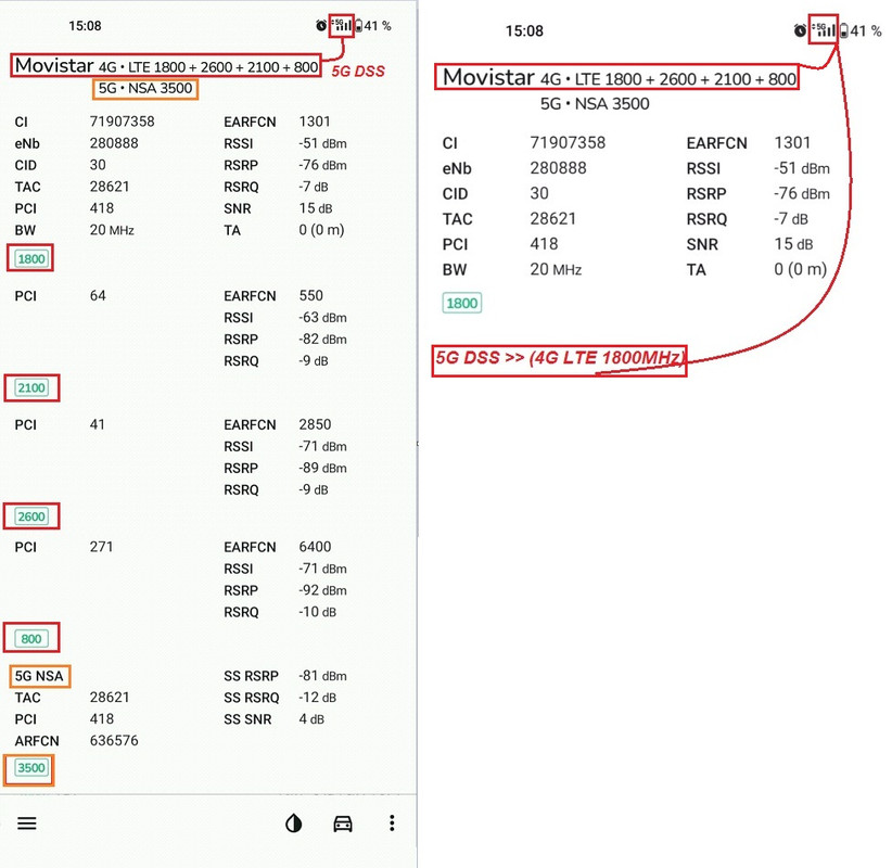 ... yo no he conseguido conectarme todavía, aunque puede ser que en la zona donde me muevo la Estación Base no tenga instalado/configurado Equipos 5G SA En principio los requisitos son: - tener una SIM moderna. Si se conecta a 4G (LTE), entonces, debería poder conectarse a 5G Para comprobar si tienes una SIM moderna compatible con 4G y 5G hacemos una llamada con el código: *#102# y tecla de llamada Si la SIM es compatible con 4G y 5G debe salir un mensaje USSD de este tipo: ![]() -Si en el mensaje USSD sale 4G, entonces, la SIM es compatible con 4G y 5G. Pero es posible que en este caso solo se conecte a 5G NSA y 5G DSS -Si en el mensaje sale 5G, entonces, la SIM es de las más actuales y posiblemente se pueda conectar a 5G SA (en la imagen aparece un mensaje USSD de una SIM 5G comprada a finales de 2023) - Si el mensaje USSD que aparece es del tipo: "P15 32KB", etc. significa que la SIM es antigua y no compatible con 4G, 5G Movistar: conexión del Móvil a 5G SA: Hay informaciones que indican que Movistar actualiza/actualizará vía OTA la SIM para la conexión 5G SA, debido a que en 5G es obligatorio que el código identificador de la línea vaya encriptado, cosa que no ocurre en 4G. Se supone que esa actualización se refiere a SIM modernas que indican 4G en el mensaje USSD, aunque no sé si también afectará a las más actuales que indican 5G en el mensaje USSD Comprobar la Banda, la Frecuencia, etc. a la que está conectado el Móvil: Aunque el Movil indique que está conectado con 5G existen distintos tipos de tecnologias, que explicado de una forma muy simple: - 5G DSS (Dinamic Spectrum Sharing) que combina las mismas frecuencias del 4G (agregación de Bandas 4G= se utilizan varias bandas de forma simultánea) y utiliza el mismo enlace portador del 4G para mandar los Datos 5G (el Core es 4G y el enlace portador es el del 4G) - 5G NSA (Non Stand Alone) el Core es 4G y el enlace portador para mandar Datos es especifico del 5G - 5G SA (Stand Alone) el Core es 5G y el enlace portador es 5G App gratuitas con información de Tecnología, Banda, Frecuencia, etc. sin tener el Móvil Rooteado Ejemplos de App usadas con el Móvil OnePlus 9 Pro y con señal 5G de la misma Antena (Estación Base) App NetMonster Ejemplo de una conexión 5G DSS (agregación de Bandas 4G=se utilizan varias bandas de forma simultánea) ![]() App Cellular-Pro Ejemplo de una conexión 5G NSA: Banda 78 Frecuencia 3500MHz ![]() App Network Cell Info Lite Ejemplo de una conexión 5G DSS (agregación de Bandas 4G: Banda 3, Banda 7) que la App identifica como 5G NSA (es la misma conexión que la de la App NetMonster) ![]() App Net monitor Ejemplo de una conexión 4G con OnePlus 9 Pro en entorno RURAL : Banda 20, Frecuencia 800MHz -el Movil OnePlus 9 Pro indentifica la conexión como 4G+ al lado de las rallitas de la señal, quizas para indicar que está conectado en 4G a la Banda de mayor penetración (Banda 20 Frecuencia 800MHz), aunque más bien si el icono 4G+ corresponde con LTE Advanced, entonces, indica agregación de Bandas 4G (con la combinación simultánea de dos frecuencias 4G se consige más velocidad) ![]() Otra App que da mucha información es la App Network Signal Guru, pero se necesita un Movil Root; aunque con las App anteriores obtenemos información más que suficiente etc. Bandas y Frecuencias de 5G SA de Movistar: Dependiendo de la localidad y de la Estación Base (antena) las Bandas y Frecuencias 5G disponibles cambiarán, pero en principio las Bandas y Frecuencias del 5G SA en Movistar son: - Banda 78 Frecuencia 3500MHz en las App debe aparecer como 5G SA y al lado de las rallitas de la señal del Movil aparece 5G - Banda 28 Frecuencia 700Mhz en las App debe aparecer como 5G SA y al lado de las rallitas de la señal puede aparecer como 5G+, en lugar de 5G, dependidendo de la marca del Móvil. (Aunque hay informaciones comerciales que identifican 5G+ como 5G SA, eso debe ser simplemente para identificar que el 5G es SA, ya que para 5G SA Banda 78 Frecuencia 3500MHz, al lado de las rallitas con la señal del Movil aparece 5G y para la Banda 28 Frecuencia 700MHz en algunos Móviles aparece 5G+, quizas para indicar que estamos conectados a la Banda 5G de mayor penetración: la Banda 28 Frecuencia 700MHz tiene mayor penetración que la Banda 78 frecuencia 3500MHz)... el icono 5G+ no tiene nada que ver con el 5G Advanced (=icono 5GA) ya que todavía no se ha desplegado (sólo está desplegado y en pruebas en China desde marzo 2024) Identificar la Estación Base y las Bandas y Frecuencias de la que el Movil coge cobertura Sabiendo la dirección de la Estación Base podemos ver qué Bandas y Frecuencias tiene Localizador de Estación Base para ver los equipos instalados (Bandas y Frecuencias): https://geoportal.minetur.gob.es/VCTEL/vcne.do ¡Feliz año! Última edición por josemar99 Día 16/08/24 a las 13:11:48. Razón: 4G+ _ LTE Advanced _ 5G+ _ 5GA = 5G Advanced |