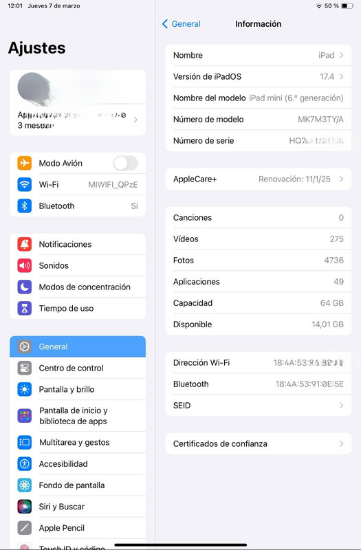 * Descripción general y otros comentarios: Vendo Ipad Mini 6 64 Gigas Wifi Gris impoluto con accesorios precintados y con Apple Care plus Activado seguro de roturas de apple hasta el 8/01/2025 además de garantía con apple hasta el 08/01/2027