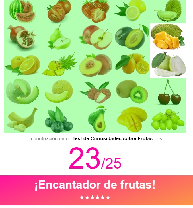 https://www.arealme.com/fruit-trivia-quiz/es Ranking 1° ivan1998 24 2ª Lioness 23 3ª marimel 21 4° TheMR2rT 19
