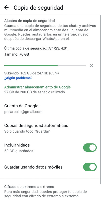 Tardará un huevo, pero te lo subirá. La primera es la que más tardará, por lo evidente. De todas formas, después de la primera, dale a guardar al menos una o dos veces más. Y no borres tu móvil Android antiguo hasta que no compruebes que está todo el WhatsApp bien clonado en el móvil nuevo. Te la has jugado mucho llevando dos años y pico sin hacer copia de seguridad. |