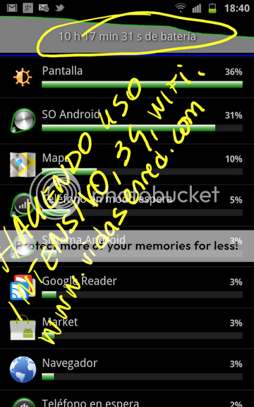 ![]() Bueno os dejo una captura, para que veáis como se funde la batería, tengo unas 70 aplicaciones, utilizó regularmente pulse, el navegador, el brillo al mínimo, tengo la 2.3.5 que venía y hecho root Enviado desde mi GT-N7000 usando Tapatalk |