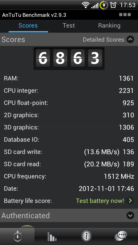 Me pones el test pero no me respondes a las preguntas, supongo que será con la rom que aparece en tu avatar, y no sé si será con algún kernel distinto al que lleve de serie dicha rom.