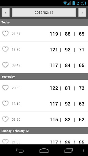 No es al introducir datos. Es cuando visualizas todo tu historial. Monitorea la presión arterial de cada día y si hay varias en 1 día aparece una cabecera de bloque (que sería la fecha con background gris)