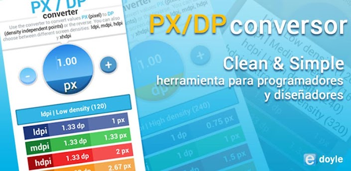 PX DP Conversor es una herramienta simple pensada para un público pequeño, diseñadores y programadores. El conversor nos permite realizar conversiones entre PX (pixel) y DP (density independent pixel). Además de poder trabajar bajo la resolución de pantalla que deseemos (ldpi, mdpi, hdpi y xhdpi). La idea es facilitar el proceso de "maquetación", cuando el diseñador nos pasa las imágenes y nosotros como programadores debemos de construirlo. El uso de DP en lugar de PX permite que nuestra app se vea correctamente sin importar las resoluciones. Descargar en Google Play La aplicación la cree esta semana y es la primera que publico ^ ^ |