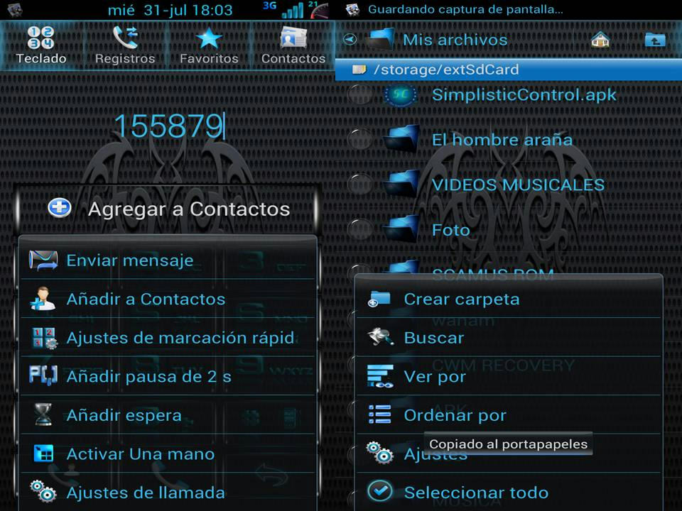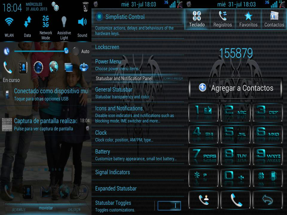 Tema Scamus Blue Lightning para Simplistic V 3.6 Detalle: Tema adaptado a Simplistic V3.6 widget transparentes musica, monitoreo de aplicaciones, contactos, aplicaciones favoritas, tiempo aplicaciones transparentes contactos, lista de llamadas, galeria, camara, musica, mms, conficuracion, radio, calculadora menus transparente y azul fecha y hora de la cortina azul área de notificaciones transparente(gracias a dragones1978) numeros de discados azul configuracion completamente azul nuevos iconos y mas Importante el zip contiene el mod simplistic V 3.6 ya que tiene unos retoques estéticos mas el temas azul trabajando 100% agradecimiento al creador simplistic LegendK95 hola amigos Acá les dejo la solución para el texto blanco con poca visualización en aplicaciones externas este arreglo solo usarlo si presentan ese problema de lo contrario sigan disfrutando del tema Descargar aca saludos y muchas bendiciones Agradecimiento LegendK95 Wanam c0rsaro381(teclado) Dragones1978(por ayudarme con su experiencia y su buena disposición) Winterlove (Transparent S4 Multiwindow) Maquinabaja Raubkatze motomoto00 BoBCatRoM Soloilmeglio Devabhishek xda greetings and blessings