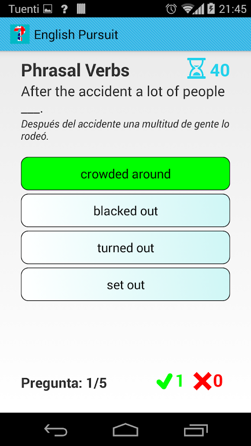 Hola a todos, os presento una aplicación desarrollada como trabajo fin de grado de ingeniería informática. Se trata de un juego de preguntas y respuestas al estilo Atriviate o Preguntados en el que puedes jugar contra amigos y rivales de todo el mundo para ver quien sabe más de ingles en varias categorías: Phrasal Verbs, Pronouns, Vocabulary, Prepositions, Irregular verbs...