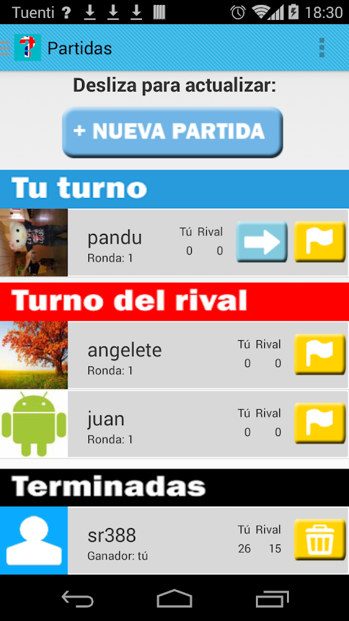 Agradecería muchísimo que la probaseis y me dijerais qué tal. En la aplicación mi nombre de usuario es "angel3" por si queréis probarla jugando contra mí. Podéis descargarla desde Google Play aquí https://play.google.com/store/apps/d...englishpursuit. Espero que os guste y comentar cualquier cosa. |