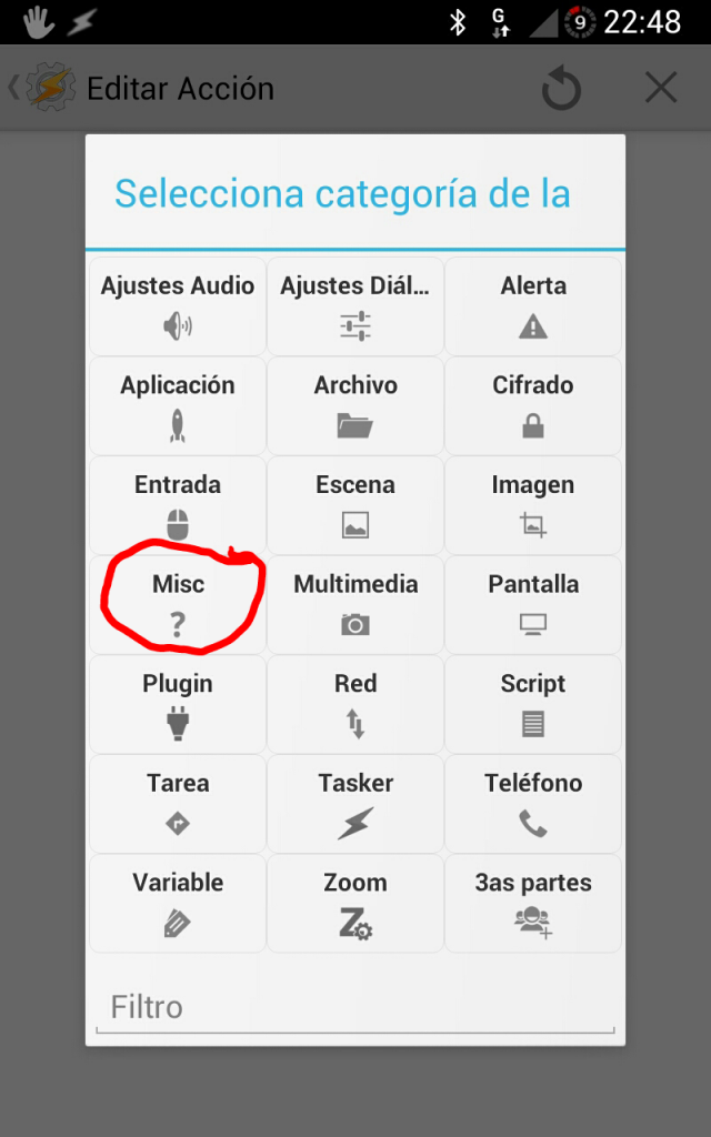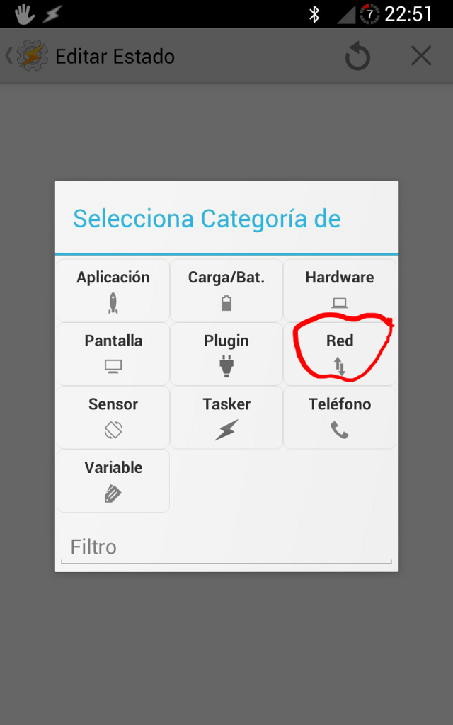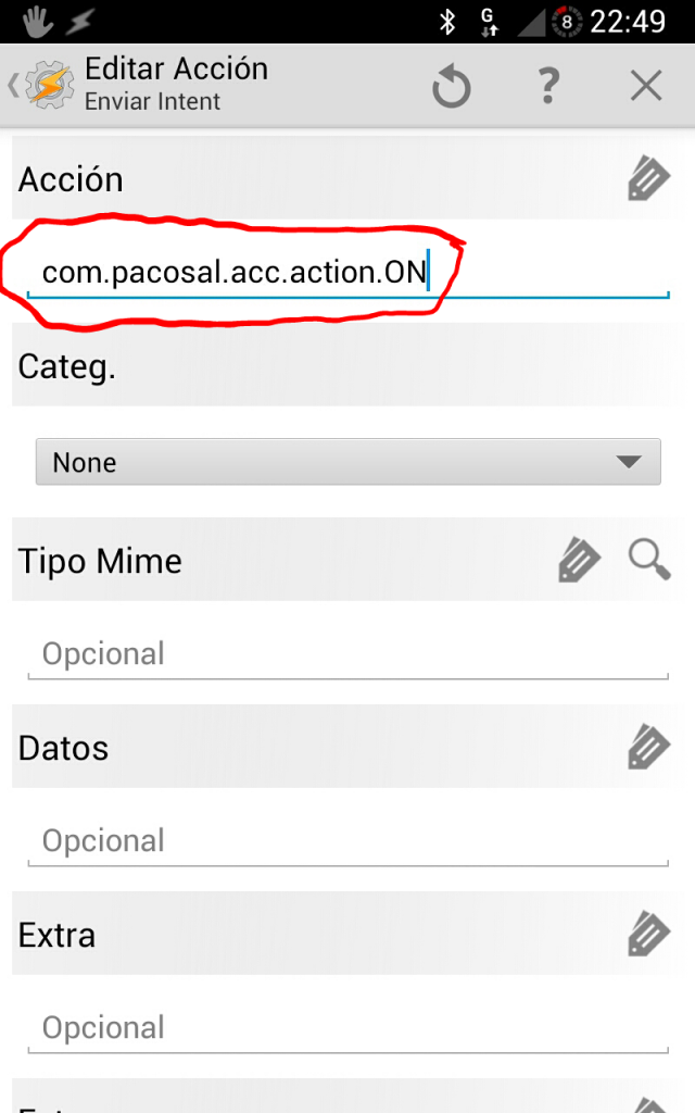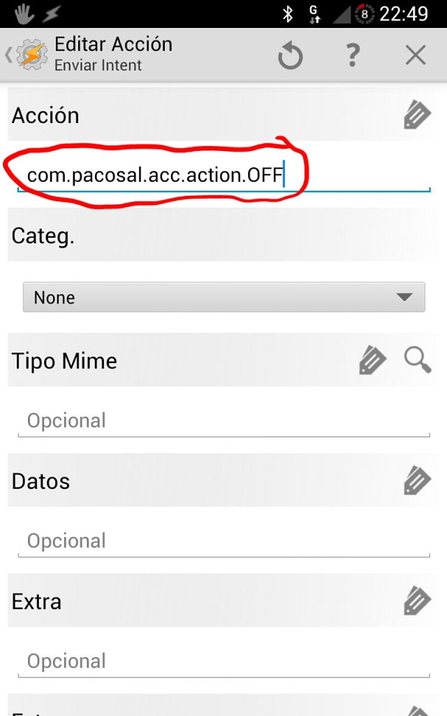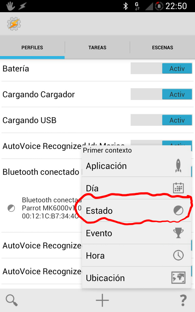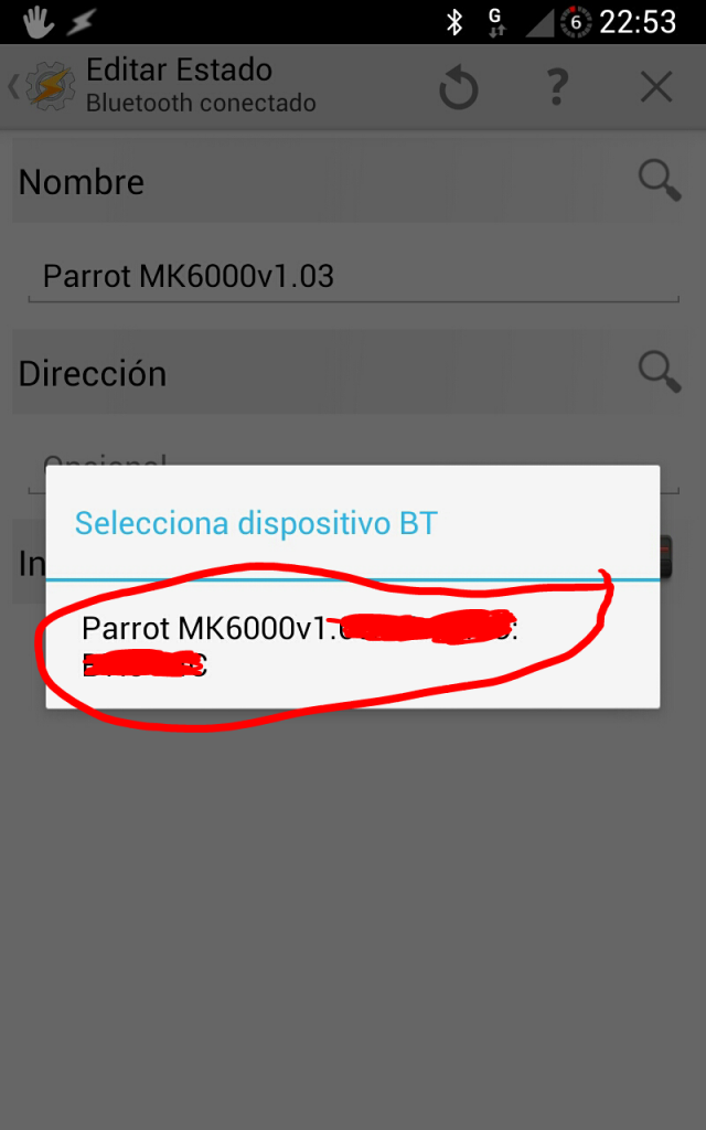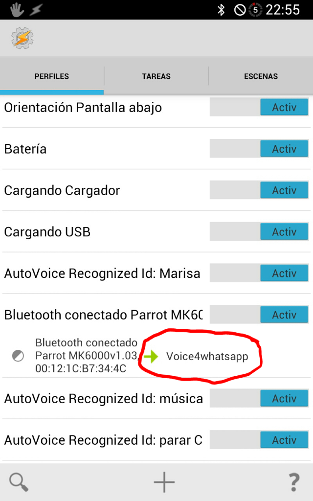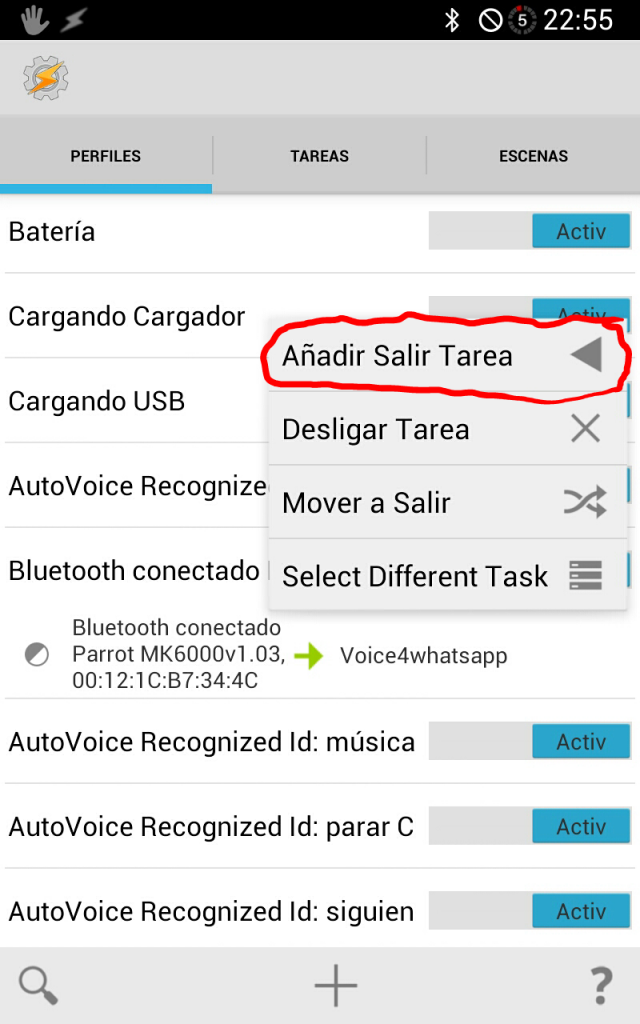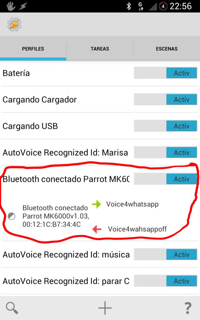 Programas necesarios: - - Instalamos las dos aplicaciones. Abrimos Tasker, 1 - hacemos click en Tareas (1) y luego en el icono + (2) y le damos el nombre que queramos. Yo tengo puesto Voice4whatsapp ![]() 2 - En la pantalla que aparece hacemos click en el icono + ![]() 3 - Seleccionamos la opción Misc ![]() 4 - Ahora seleccionamos la opción Enivar Intent ![]() 5 - Ahora escribimos en la primera línea exactamente lo que aparece en esta captura (cuidado con la corrección automática) ![]() 6 - Repetimos los pasos desde el 1 (dándole otro nombre distinto en mi caso Voice4whatsappoff) hasta 5 , pero ahora introducimos el siguiente texto. ![]() Ahora vamos a crear el perfil. Damos click en Perfiles y luego en el símbolo + (2) ![]() En la ventana que sale, elegimos ESTADO ![]() Aparece la siguiente ventana. Elegimos RED ![]() En la siguiente ventana, elegimos bluetooth conectado ![]() Ahora shacemos click en la lupa que aparece rodeada ![]() Aparecen los dispositivos bluetooth que tenemos emparejados con el móvil. Seleccionamos el manos libres bluetooth. ![]() Ahora hacemos click en la segunda lupa ![]() Y elegimos la dirección MAC que aparece que es la de nuestro manos libres (he borrado mis datos por seguridad) ![]() Damos en la flecha atrás de nuestro dispositivo y en la ventan que aparece, seleccionamos la tarea que hemos creado en primer lugar. En mi caso Voice4whatsapp Ahora aparece ésta ventana. Dejamos apretado encima de la zona marcada en rojo. ![]() Hacemos click en Añadir Salir Tarea ![]() Y seleccionamos la segunda tarea creada, en mi caso voice4wahtsappoff Y nos queda así. ![]() Damos flecha a trás de nuestro móvil y YA HEMOS TERMINADO. Ahora, cada vez que nos conectemos al manos libres del coche nos leerá en voz alta (por los altavoces), los correos de GMAIL, Line, Whatsapp, Sportbros...etc Última edición por rilo Día 02/07/13 a las 09:58:54 Razón: No se veían las imágenes |