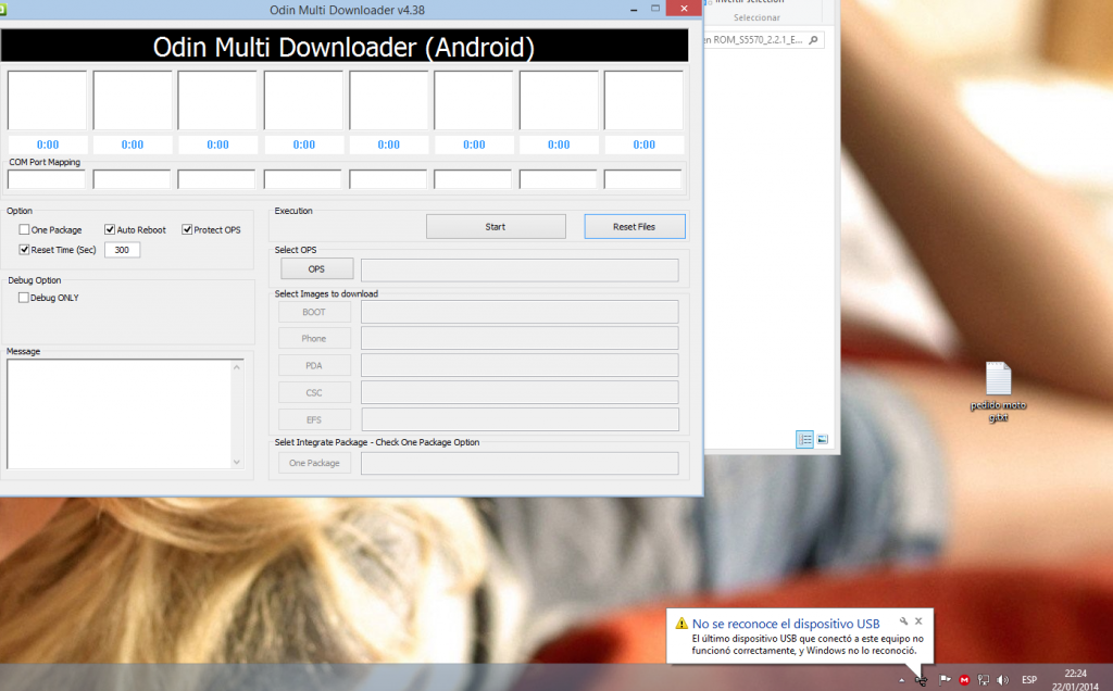Los drivers estan instalados Cuando lo pongo en modo downloader, y lo conecto, no lo detecta odin y me sale esto Por cierto, tengo windows 8.1 Este proceso siempre que lo he hecho he tenido windows 7 y windows 8, nunca lo he hecho con windows 8.1 He probado con varios cables y en varios puertos Alguna solucion? Gracias de antemano y un saludo
