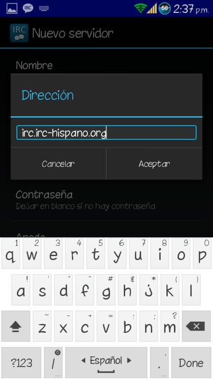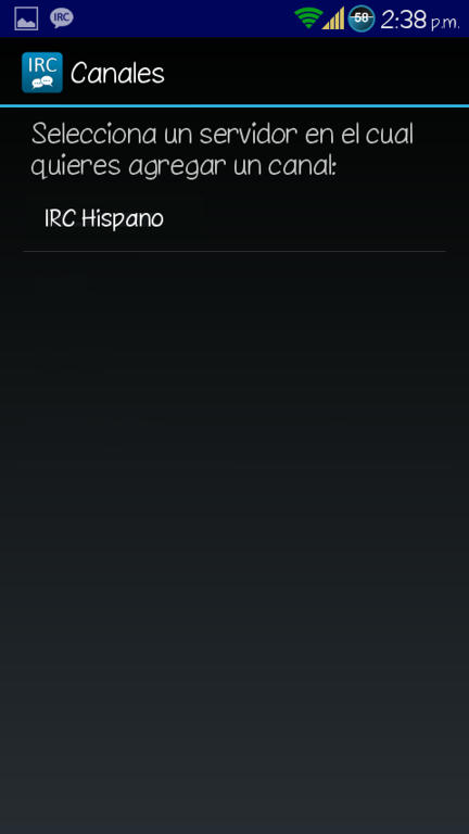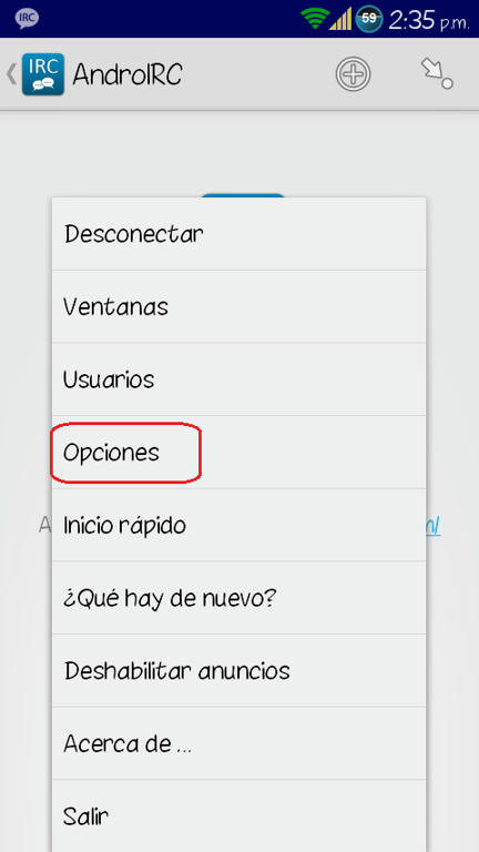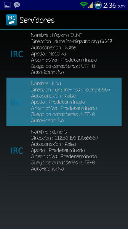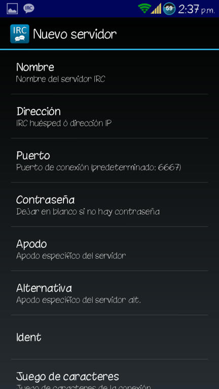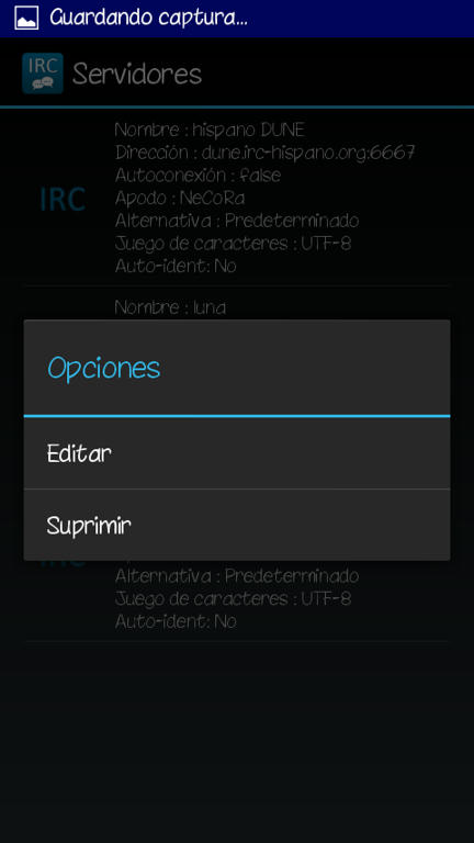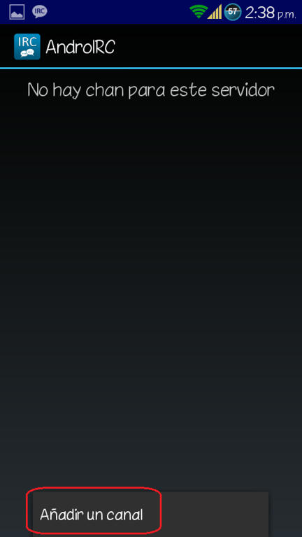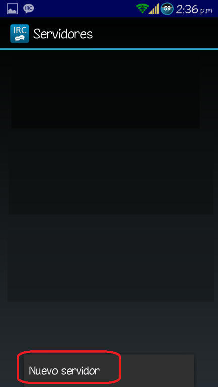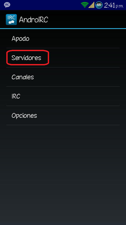 Os podéis conectar a través de la web del IRC Hispano aquí: WebChat. Os ponéis un Nick y en canal escribís: #htcmania y listo, ya podréis entrar a charlar o consultar a los demás usuarios vuestras dudas. Para conectarse a través del movil (Android) os descargáis la app del play AndroIRC Free o la versión de pago AndroIRC Premium Una vez dentro de la app le damos a la tecla física de Menú y le damos a opciones: ![]() Luego damos a servidores: ![]() Y nos saldrán unos 4 servidores ingleses (en la imagen no aparecen por que yo ya lo había modificado) Pulsamos sobre cada uno de ellos para que se nos abra un menú en el que nos da 2 opciones "editar" y "suprimir" Suprimimos todos. ![]() ![]() Luego de borrar esos servidores daremos a la tecla física de Menú y nos saldrá opción para añadir un servidor nuevo. ![]() En Nombre pondremos lo que queramos (yo puse IRC Hispano) Y por último en "Dirección" ponemos esto: irc.irc-hispano.org ![]() ![]() Salimos dándole a atrás y volvemos a este menu: ![]() Pero en esta ocasión le daremos a "Canales" y veremos q aparece el servidor que hemos creado anteriormente. ![]() Pinchamos sobre el servidor creado y luego damos a la tecla física de Menú y añadimos nuevo canal ![]() En él solo deberemos modificar el primer apartado "Nombre del canal" y escribiremos: htcmania Luego volveremos a la pantalla principal y nos conectamos al servidor y entraremos automáticamente al canal de HTCmania: ![]() Y creo que eso es todo. Espero que poco a poco vayamos llenando el canal para mayor facilidad de ayuda entre tod@s, eso si, será de pequeña ayuda, cosas puntuales que no merecen crear un post en el foro. Saludos