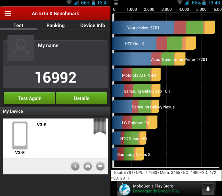 Aviso: Las pruebas mostradas a continuación se han realizado con un iNew V3 original y sin ninguna modificación en cuanto a desarrollo salvo las propias que vienen realizadas de la tienda donde lo he comprado (antelife). Con esto quiero decir que diferentes ROMs de otras tiendas pueden dar otros resultados mejores o peores. Os dejo antes que nada una videoreview ya que se que algunos os da pereza leer :qmeparto: , no obstante leed todo el post ya que se especifica con mayor detalle. ÍNDICE -ESPECIFICACIONES -UNBOXING -CUERPO Y MATERIALES -PANTALLA -CAMARA -WIFI Y NAVEGACIÓN -PROCESADOR, GPU Y JUEGOS -GPS -ALTAVOZ -BATERIA -OTROS DETALLES -CONCLUSIONES Y OPINION PERSONAL. -DONDE COMPRAR? ESPECIFICACIONES Procesador: MTK6582 Quad-core 1.3GHz 1GB RAM, 16 ROM Pantalla de 5.0 pulgadas, OGS Screen,1280 x 720pixeles Cámara 13.0MP Sony Exmor RS F2.0 + frontal 5 Mpx DualSim GSM 900/1800 MHz + WCDMA 2100MHz Bluetooth , wifi y GPS Batería 1830 mAh Grosor de 6.5 mm Peso: 128 UNBOXING Todos los accesorios y demás artículos vienen dentro de una caja de cartón muy rígida y bastante elegante. *Caja original iNew * Teléfono móvil *Batería *Cargador (transformador) con clavija de serie para España (no es adaptador) *Cable datos/carga microUSB-USB *Protector de pantalla (puesto) *Protector pantalla extra *auriculares *Funda imantada con visor de hora y notificaciones. ![]() CUERPO Y MATERIALES Sin duda la estética es uno de los puntos fuertes de este terminal y es que sus bordes superior e inferior redondeados, sus laterales con reborde metálico, la mezcla de colores y la gran pantalla que no deja a la vista ningún otro elemento son todo potencial. ![]() La delgadez de este iNew se reduce a los 6,5 mm y es que parece mentira como puede cambiar la estética y tacto reduciendo tan solo unos milímetros y por si fuera poco es tan ligero que no se si puede decirse es una ventaja jajaja a veces no piensas ni que llevas el móvil. ![]() Claro está todo bonito no iba a ser y los materiales de la parte trasera siguen diendo plasticos de mala calidad en el caso de la carcasa que cubre la batería ya que esta es muy endeble e incluso al retirarla da la sensación que se va a partir, por otra parte el plastico trasero tiene una textura que agarra bien y con un tacto no tan ratero como el de otros móviles chinos o nada mas lejos que de algunos samsungs. ![]() En general el telefono está bien ensamblado , no cruje aunque en mi caso (no se si todos) la parte inferior de la junta de la tapa de la bateria queda un poco holguera pero nada preocupante. Os dejo tambiém la distribución de elementos cuando retiramos la tapa de batería ![]() Normalmente los dos slot (ranuras) de DualSIM suelen sera para tarjetas miniSIM (sí las normales) y yo de momento no he visto con microSIM pero cada vez son mas usuales estas pequeñas tarjertas asi que el V3 opta por "ni pa ti ni pa mi" , así que un slot de cada tipo. Como indico el slot de miniSIM es el que funciona con WCDMA (3G) PANTALLA Si ya con abrir la caja nos quedamos medio boquiabiertos cuando cogemos por primera vez el telefono, la primera vez que encendamos la pantalla puede que se nos caiga la baba. Quizás exagere pero de todos los móviles chinos que he tenido sin duda este tiene una calidad increíble , es muy suave al tacto aún usando protector y los colores son vivos y con buena luminosidad. Evidentemente sus 5 pulgadas ayudan a que sea mas espléndida todavía y la respuesta táctil es excelente y muy sensible al tacto. ![]() Podeis ver la original de la siguiente imagen en este enlace http://maskeunblog.files.wordpress.c...09/colores.jpg ![]() En cuanto a la respuesta en ambiente con luz solar he de decir que también me ha sorprendido para bien y es que en modo automático no he tenido que poner ni una sola vez la mano a modo sombra y es que parece que la tecnología IPS funciona realmente bien y el añadido de la tecnología OGS permite pantallas mas delgadas de ahí sus 6,5 mm Para completar el conjunto frontal en la parte inferior tenemos los botones táctiles menu, home y atrás que no se ven a simple vista cuando la pantalla está apagada sino que son retroiluminado y al pulsar sobre ellos se encienden. Cabe señalar el detalle del botón home, iNew deja de lado el tipico icono con forma de casa para simplemente NO poner ninguno y añadir una luz color azul que a la vez de elegante hace que el V3 no sea un chinorri más. ![]() CÁMARA Uno de los elementos que muchos usuarios temen a analizar una vez compran un telefono chino es la cámara y es que no solemos ver grandes calidades pero iNew V3 es una excepción en toda regla y es que monta como cámara principal ni mas ni menos un sensor de 13Mpx Sony Exmor RS con apertura F2.0 y flash LED de philips. Vaya parece que no era tan complicado montar buenos objetivos a precios baratos. ![]() A mi me ha convencido muy mucho, está claro que esto es un móvil y ha de ser juzgado como tal y que no solo porque nos digan Sony nos hemos de creer que todo es una maravilla, así que lo mejor es que os deje unas fotos y ya vosotros opináis. Automatico, sin flash, ambiente nuboso. ![]() Automatico, todo a oscuras, con flash, ISO 1200, distancia al objeto unos 2 m ![]() Automatico, con flash , ISO 203 , distancia al objeto unos 15 cm ![]() He encontrado un fallo de software y es que en condiciones de poca luminosidad al enfocar debería de saltar el flash led pero no lo hace por lo que si hay poca o nula luminosidad solo podremos pulsar el obturador realizando la foto directamente con flash pero al no enfocar el objeto pues la foto saldrá borrosa. Como comento es un fallo de software por lo que con alguna actualización, ROM o incluso alguna aplicación de cámara se puede solucionar. En cuanto a la cámara frontal no podemos decir mucho ya que es algo mas básica y la calidad algo peor pero merece ser nombrada al ser de 5 megapixeles por lo que en fotos con bastante iluminación será muy util para aut