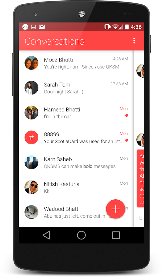 QKSMS ( https://play.google.com/store/apps/d...com.moez.QKSMS) se necesita estar apuntado en la beta para descargarla. Primero solicitar participar en Google+ (QKSMS ALPHA) y meterse aquí ( https://play.google.com/apps/testing/com.moez.QKSMS) |
