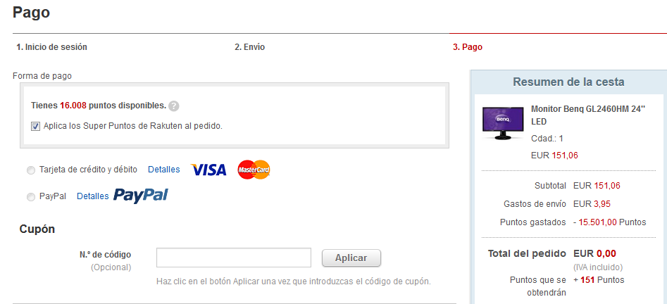 Hola, he entrado a rakuten y me acabo de dar cuenta que dispongo de 16mil puntos. Lo cual es una rebaja de 160€.