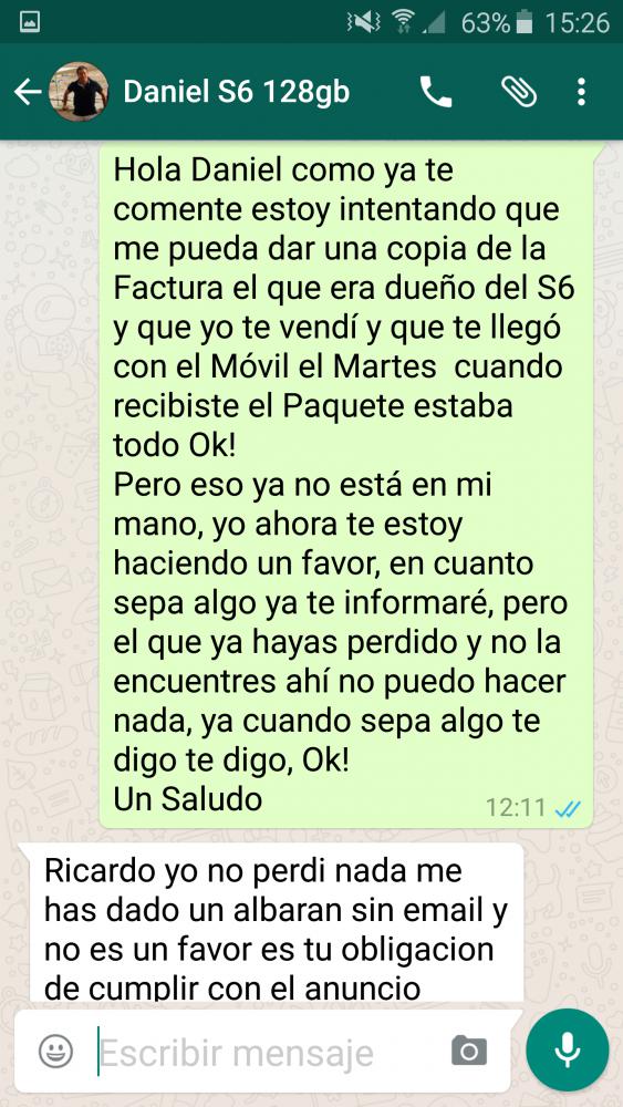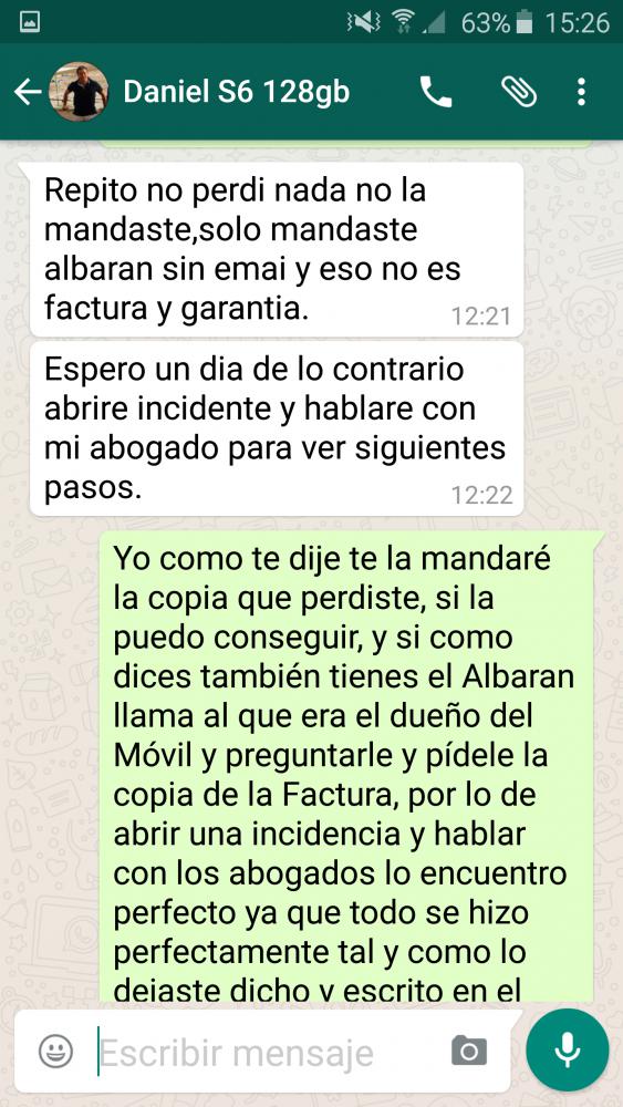 Lo que no me entra en la Cabeza es que tengas un problemas con el Móvil y lo lleves al Vodafone y el servicio Oficial Samsung y no te pongas en contacto conmigo y cuando lo haces me dices que no tienes la Factura que el albarán no te sirve que el móvil no encendía pero luego si y que tenían que ponerle un Rom en el Servicio Oficial de Samsung que pueden que te cobren algo de dinero por el arreglo vas y lo dejas igualmente siendo un móvil Nuevo, si no tenias la Factura porque no me lo dijiste nada mas Recibir un Movil, yo es algo que hago nada mas comprar algo el comprobar la Factura y que concuerde el IMEI, por favor seamos serios! Yo por mi parte estoy haciendo todo lo posible para poder darte una copia de la Factura del Vodafone que te mande y abras perdido, pero no se si la podre conseguir, ya que no esta en mi mano, y si fuera así Vodafone no se si la manda al instante o tarda días, porque no llamas al teléfono del que era el Titular y se lo dices y te haga el favor también a ti, y ya veras como me estoy moviendo, pero como ya he dicho no esta en mi mano, ya que la Factura Original te la mandé con el Móvil y así lo abala tus Comentarios Positivos y tu Voto! No quiero pensar mal, pero no será que no te gusta el S6 y no sabes como devolverlo porque no le pasa nada y estas buscando algo! Un Saludo y espero que esto se reconduzca ya que no es de mi agrado y lo peor es que me has llegado a amenazar con la Incidencia y tus Abogados! Dejo conversación por Whtasapp de esta misma mañana, con dicha Amenaza!! Última edición por ricard33 Día 10/09/15 a las 16:41:49. |