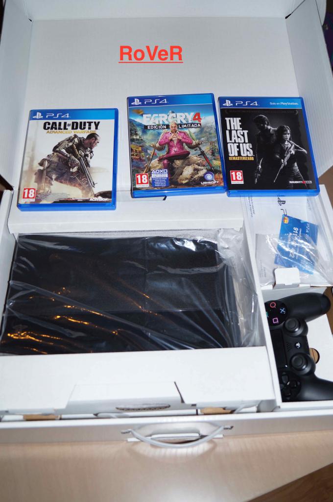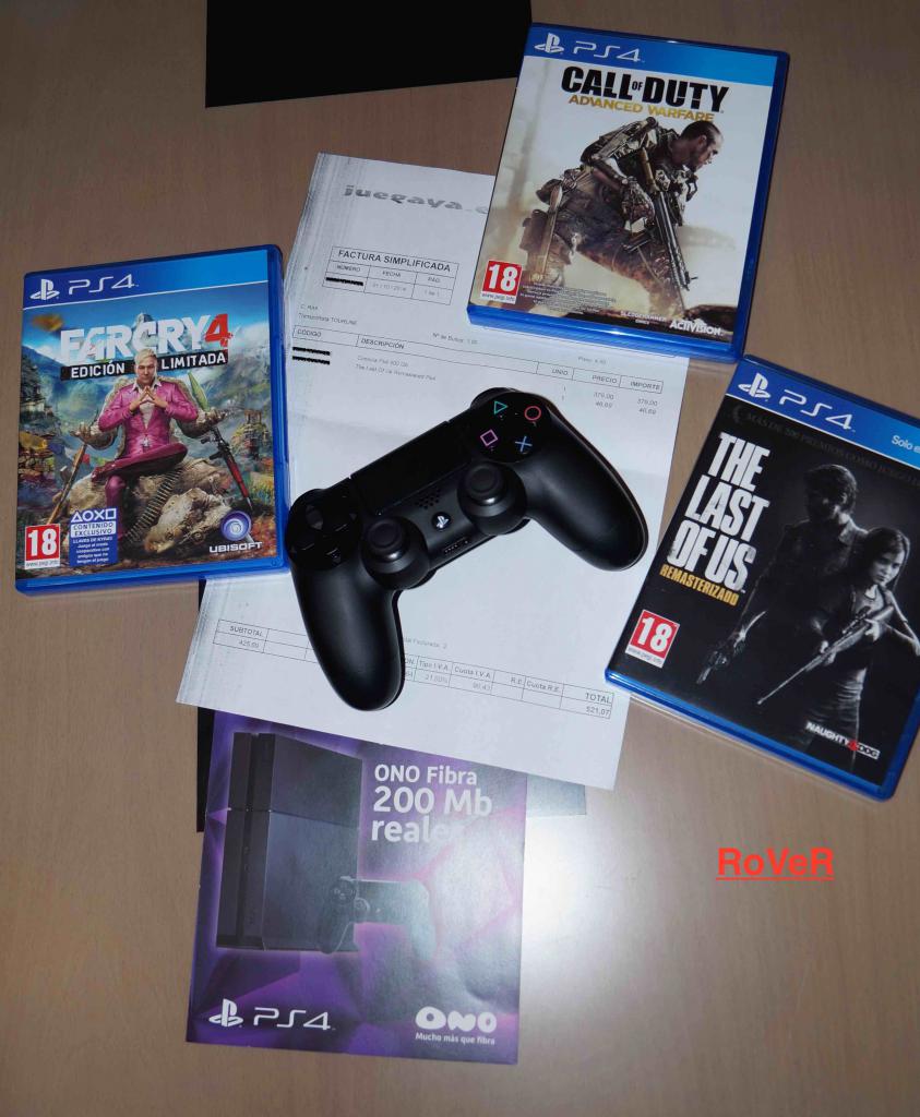 * Sobre el envío: - * ¿Dispones de factura?: Sí * Fecha de la factura: 01-10-2014 * ¿El producto está en garantía?: Sí Otros datos de interés * Descripción general y otros comentarios: La consola está como nueva, la vendo por no usarla. Los juegos que se incluyen son: Far Cry 4 (Ed.Limitada), Last of Us, Call of Duty Advanced Warfare, todos ellos en formato físico y DriveClub en formato digital. Todos los cables, incluido el HDMI están en el pack. Se incluye embalaje original y factura. 1 año de garantía a través del vendedor. 350€ trato en mano en zona sur Madrid. * Certifico que la descripción aportada es correcta: Sí * Certifico que no estoy vendiendo un producto ilegal o una réplica: Sí * Acepto las normas de la sección de compra y venta de HTCMania: Sí Fotografías reales del material * |