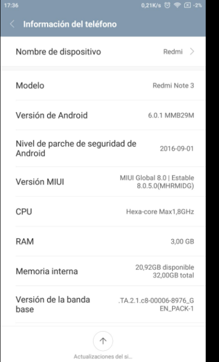podrías mandar una captura de pantalla de la versión de Miui que tienes si tiene dos ceros detrás podrás flashear sin problemas por miflash ya que no es problema del móvil ni nada por el estilo sino que la Rom da ese problema pero tú podrás instalar la rom sin ningún problema de quedarte sin batería carga muy bien el móvil y ya está Enviado desde mi Redmi Note 3 mediante Tapatalk ![]() Mi rom, como he dicho al principio, termina en MHRMIDG. El problema es que la batería marca -2% siempre. En concreto, es la MIUI Goblal 8.0 Estable 8.0.5.0(MHRMIDG). Version de Android 6.0.1 MMB29M |
