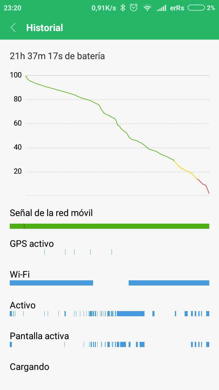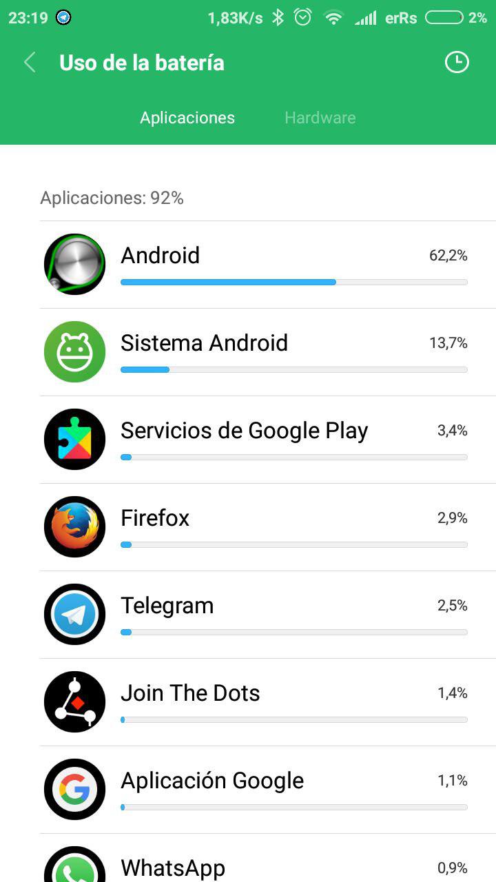 buenas, normalmente me da el teléfono 6h de pantalla, pero desde hace una semana o así no me da más de 2h de pantalla (hoy ha dado mejores resultados pero aun así son malos) con lo que el móvil no me llega al final del día sin tener que cargarlo. La verdad es que no he instalado nada raro recientemente, ha sido de un día para otro.. Tengo MIUI 8 Global 6.11.17, había pensado en actualizar vía OTA pero con los problemas que ha habido he decicido no hacerlo.