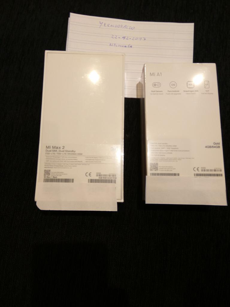 * Sobre el envío: Correos 48/72 horas(domicilio) o ASMgo 24/48 horas(recogida en delegacion). No me hago responsable de envios sin asegurar, si se quiere asegurado a cargo del comprador. * ¿Dispones de factura?: No * Fecha de la factura: - * ¿El producto está en garantía?: Sí Otros datos de interés * Descripción general y otros comentarios: - Vendo movil a estrenar, con precinto, de Xiaomi Mi Max 2, Global Version, 4/64 GB, color Negro, Snapdragon 625, Pantalla 6.44", Bateria 5300 mAh, con un año de Garantía en china(Gearbest). Precio: 200€ G.I. 195€ en mano. - Vendo movil a estrenar, con precinto, de Xiaomi MI A1, Global Version, 4/64, color Gold, Qualcomm Snapdragon 625, banda 20 (800), cargador europeo, con 1 año de garantia en china(Gearbest). Precio: 190€ G.I. 185€ en mano. * Certifico que la descripción aportada es correcta: Sí * Certifico que no estoy vendiendo un producto ilegal o una réplica: Sí * Acepto las normas de la sección de compra y venta de HTCMania: Sí Fotografías reales del material * |