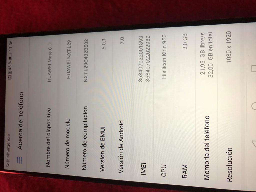 ![]() Sobre el post del foro * Título de la venta: HUAWEI MATE 8 * ¿Relacionado con smartphones o tablets?: Sí Sobre el producto * Marca: HUAWEI * Modelo: MATE 8 MOKA * Precio: 175 * Si vendes un teléfono, ¿es libre o de operadora?: Libre de fábrica * ¿Producto nuevo o de segunda mano?: Con uso * ¿Desperfectos?: ninguno * Estado del producto (de 1 a 10): 8 * Tiempo de uso del producto: casi dos años * ¿Aceptas cambios?: Quizá Sobre el método de pago * Ubicación: ALZIRA, VALENCIA * Método de pago admitido por el vendedor: