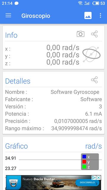 ![]() ![]() ![]() Por favor, me puede indicar alguien si en su Meizu M5 funciona el giroscopio de forma correcta, de ser así, me haría un favor enorme si instalase la app "sensores multimedia" y me confirmara el fabricante del giroscopio y la versión del mismo. Eso de "software gyroscope" me suena a que no dispone de chip fisico tipo MTK o BOSH y que lo que hace es emularlo de algún modo usando el magnetómetro y el acelerometro y calculando la posición en función de los valores dados por estos sensores que si dispone. Muchas gracias por la ayudita. |