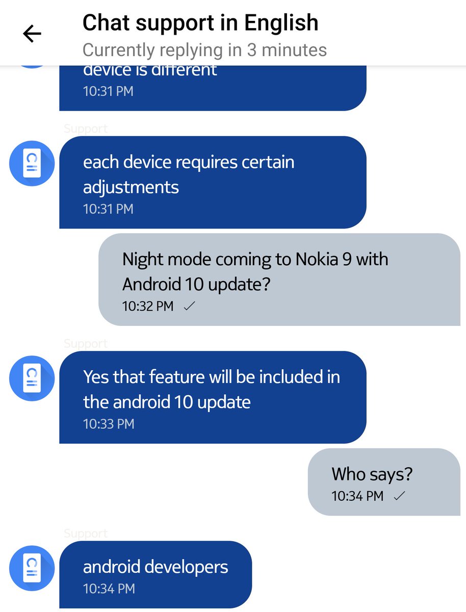 ![]() La actualización de Android 10 está programada para Nokia 9 a finales de este año. El equipo de soporte no tiene un registro de seguimiento 100% limpio para responder a las consultas de los usuarios de la manera correcta. Si bien el equipo de soporte, en cierto sentido, representa a la compañía, este anuncio no tiene el mismo peso que un anuncio de un mod a través del Foro de la Comunidad o Nokia Mobile / Juho Sarvikas a través de Twitter. Realmente espero que la actualización de Android 10 traiga las mejoras necesarias con poca luz a la cámara Nokia 9, junto con otras mejoras del sistema también. Vía nokiamob.net