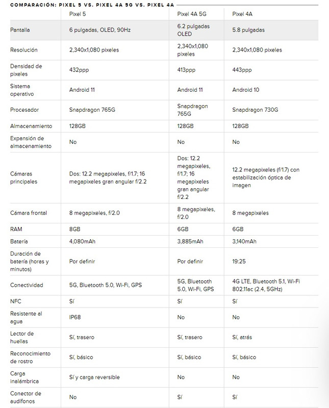 Las únicas diferencias en hardware son mayor tamaño de móvil para el 4a 5G debido a mayor pantalla ( 6.0" vs 6.2" del 4a5G ) materiales plásticos del 4a 5g frente a "aluminio" del pixel 5 ( lo tuve y parece plástico también ) 2gb de ram mas para el 5, algo más de batería ( inexplicable ésto siendo el 4a5g más grande ) más hz de pantalla el 5 ( 60 frente a 90hz ) y el tema carga inalambrica y reversible del 5. Y por último,algo importante, el 4a 5g tiene un altavoz clásico arriba en vez del de dentro de pantalla del pixel 5. Voy a comprar un 4a 5g ya que creo que las 6.2" del 4a 5g me gustarán más, pese a no tener 90hz. ![]() Si es así el 4a 5G para mí lo que pierde respecto al 5 son dos tonterías. Saludos |