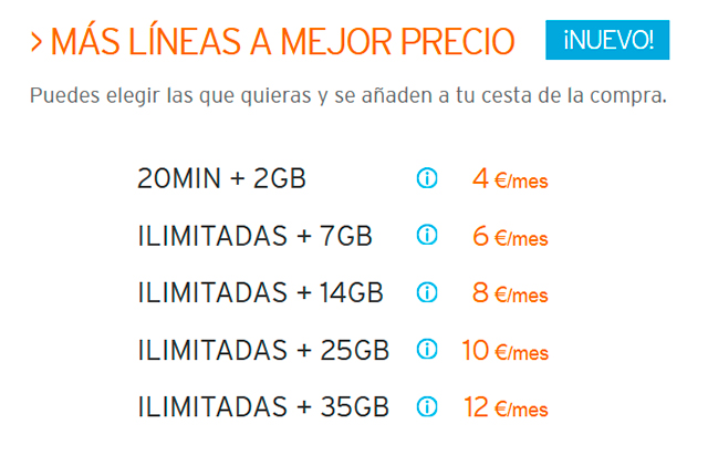 ![]() Para comprar líneas adicionales, hay que comprar o tener ya una línea de fibra y una línea de móvil de 7€ o más. Añade la FIBRA y MÓVIL que quieras, añade las LÍNEAS ADICIONALES, y ve a la cesta para ver cómo queda tu pedido. Recuerda: si ya eres cliente y tienes Fibra con una línea de móvil de 7€ o más (7€ en bonos generales) puedes contratar estas líneas adicionales o solicitar el cambio a estas condiciones en alguna de tus líneas.