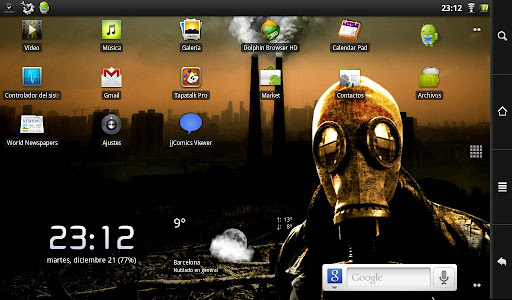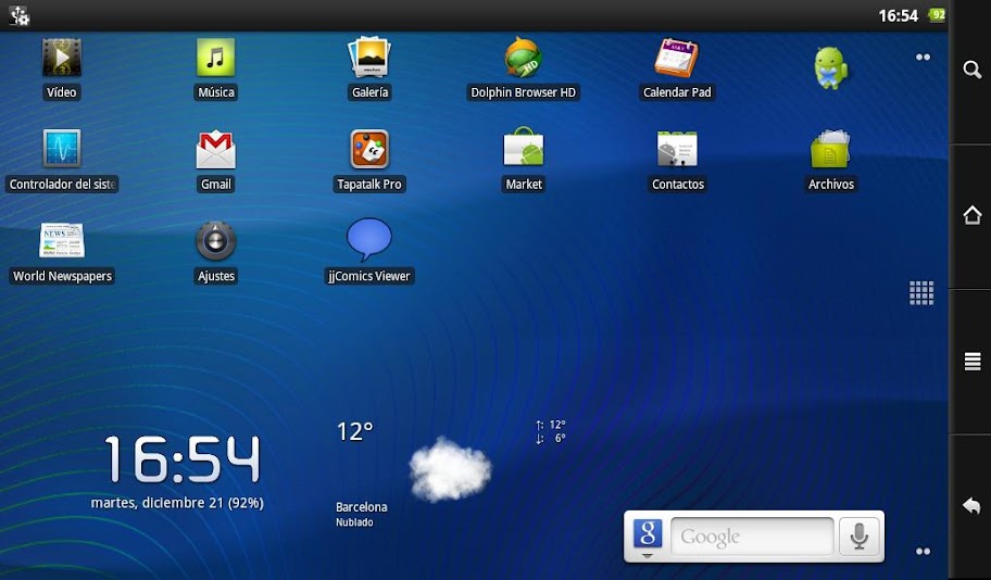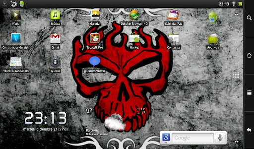 Y el launcher y widgets de tu Samsung Galaxy S se podria adaptar o instalar en la Archos? Me gustan ... Como has quitado las hierbas esas del Arhocs? De las hierbas me gusta el cambio que hace del escritorio del dia a la noche ... esto se podria mantener con algun fondo personalizado ... o algo así? Yo todavia no pongo el mio por que estoy probando cosas y no es nada definitivo ... Menos mal has puesto esto: Que yo iba a colgar una foto hecha a la tablet directamente. Última edición por franjocc Día 21/12/10 a las 17:31:01 |