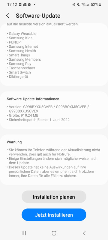 En XDA hablan de una G998BXXU5CVF2 de 254,36 MB lanzada hoy para los DBT (Alemania) y que incluye el parche de junio y que la "estabilidad general del móvil se ha mejorado": https://forum.xda-developers.com/t/c...18529/page-271 Última edición por mario123 Día 14/06/22 a las 14:23:01. |