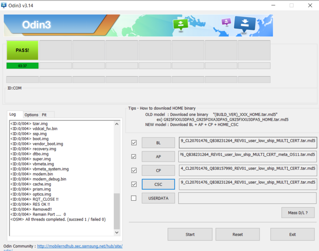 5 - Apaga el teléfono y ponlo en modo Download pulsando el botón de encendido y el de subir el volumen. Aparecerá en tu dispositivo una pantalla con varias opciones, seleccionamos Reboot to bootloader 6 - Conecta el s21 al PC mediante un cable USB que sea de fiar.Más info en HardReset.info 7 - Abre Odin. Uno de los cuadritos debajo de ID:COM debería iluminarse en azul indicando que detecta el móvil conectado. 8 - Coloca los archivos en los apartados correspondientes en Odin. AP en AP, BL en BL, CP en CP, HOME_CSC en CSC Presta mucha atención en seleccionar el fichero Home_CSC y colocarlo en CSC, sino, se eliminaran todos tus datos Una vez hecho esto, click en el botón "Star" en la aplicación Odin y a esperar que finalice el proceso de actualización. Cuando haya terminado, el S21 se reiniciará y recibirá un mensaje "Pass" de la aplicación Odin. [Fuentes] How To Install Stock ROM On Galaxy S21, S21 Plus & S21 Ultra? (All Firmware Versions) [AUB9] OFFICIAL STOCK FW-update(Odin) thread (17 Feb 21) GALAXY S21 Ultra SM-G998B Frija, una herramienta para descargar el último firmware de cualquier móvil Samsung Cómo actualizar el firmware oficial de Samsung con ODIN SAMMOBILE Última edición por reo Día 28/02/21 a las 19:14:26 Razón: Etiquetas |