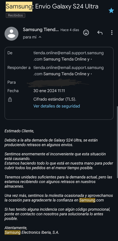 Alguien mas ha recibido este correo de Samsung sobre su pedido del Ultra 24? Yo lo pedí el 20 de enero con el watch pero no me aceptaba el codigo de primera compra del 10% y el de NUEVOGALAXY, pero no me contestan a ningun mail que les escribo aunque en este correo me dice que si tengo algun problema con los codigos me ponga en contacto con ellos lo antes posible. Lo he probado a traves del formulario de la app de samsung, al mail desde que me han mandado este correo ([email protected]) y a [email protected] pero pasan los dias y ninguno contesta. Alguien en la misma situación y que lo haya podido solucionar?